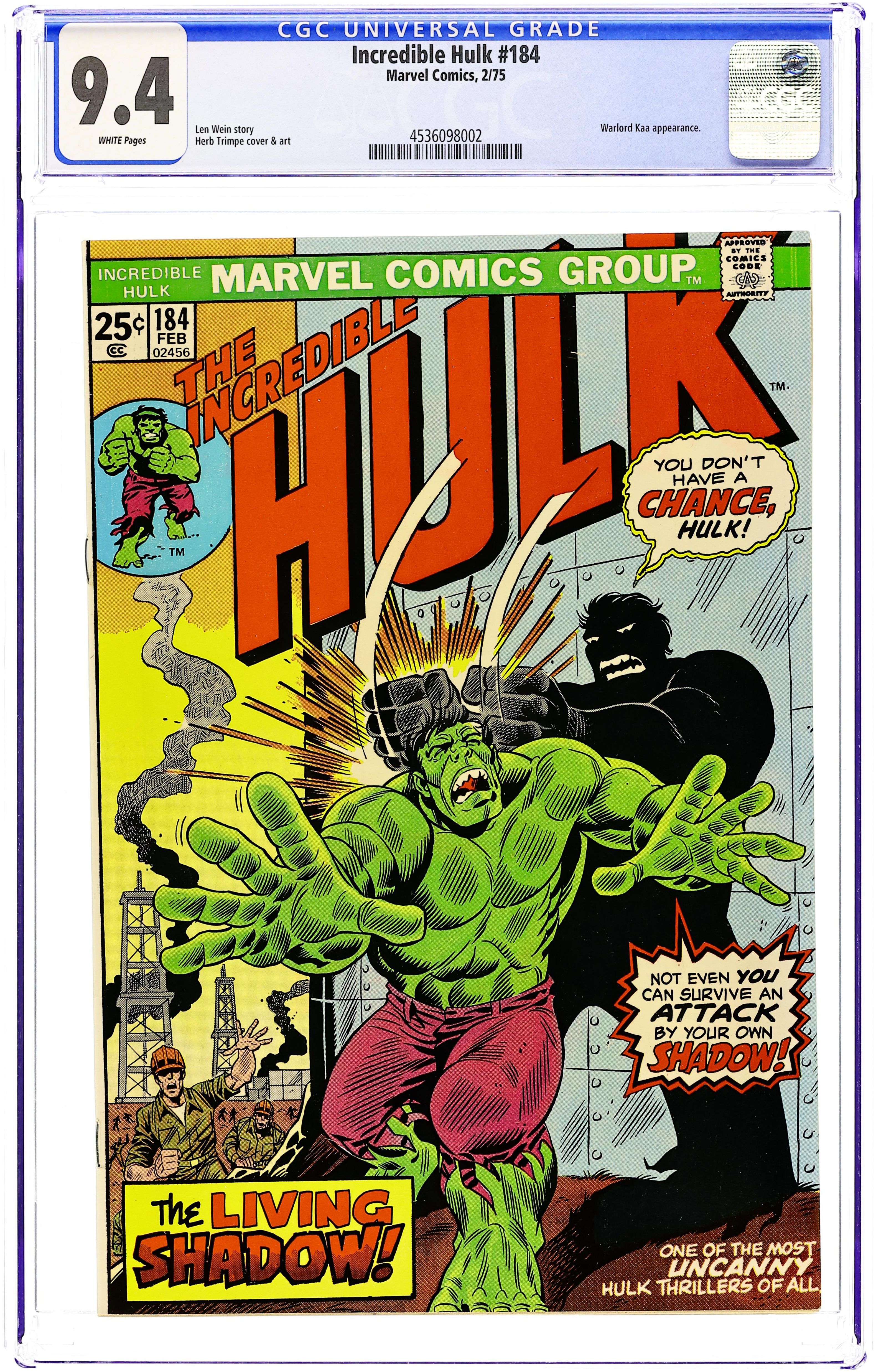 Cover art by Herb Trimpe. "Shadow on the Land!," script by Len Wein, art by Herb Trimpe; A group of army personnel are transporting several canisters of toxic waste from Chicago en route to Tulsa, Oklahoma; The truck runs afoul of the Hulk and the canisters open, inundating the Hulk in radioactive chemicals; These chemicals alter the Hulk's gamma-warped aura; This alteration is noticed by a two-dimensional alien warlord known as Kaa, the Living Shadow; Taking control of the Hulk's shadow, Kaa assumes all of the brutes strength and savagery; They battle one another throughout the course of the day, but as night time approaches, flood lights from a nearby oil field are turned on, and Kaa is bathed in intense light; The light dispels Kaa's form and he disappears, seemingly destroyed. Marvel Value Stamp Series A: The Mandarin. 36 pgs., full color. $0.25. Cover price $0.25. Grade: CGC 9.4 explanation of grade Condition: Used (collectible)