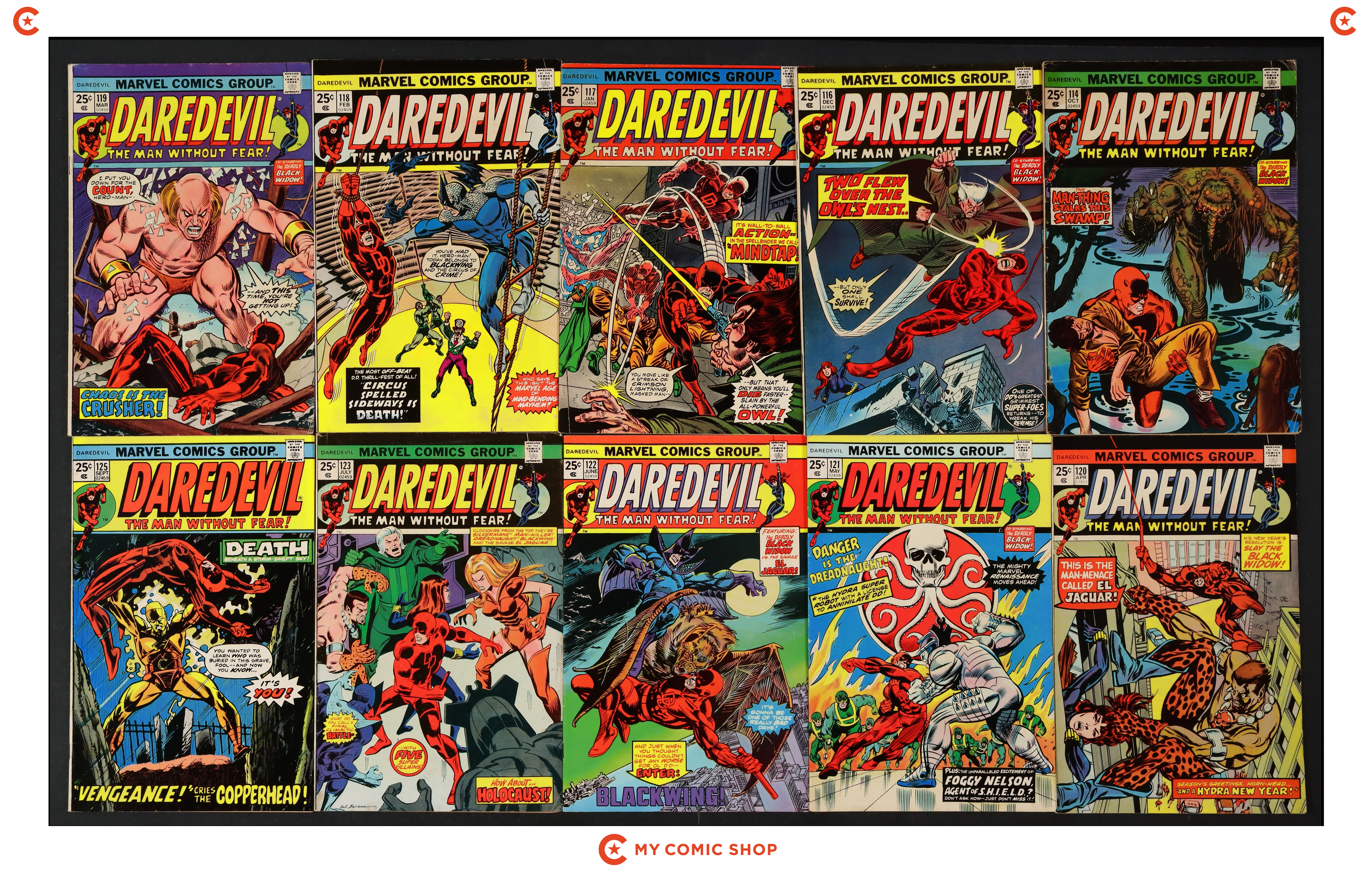 Issues 114, 116-123, and 125 of Daredevil (1964 1st Series). Most will grade in the VG range with a couple grading closer to GD.