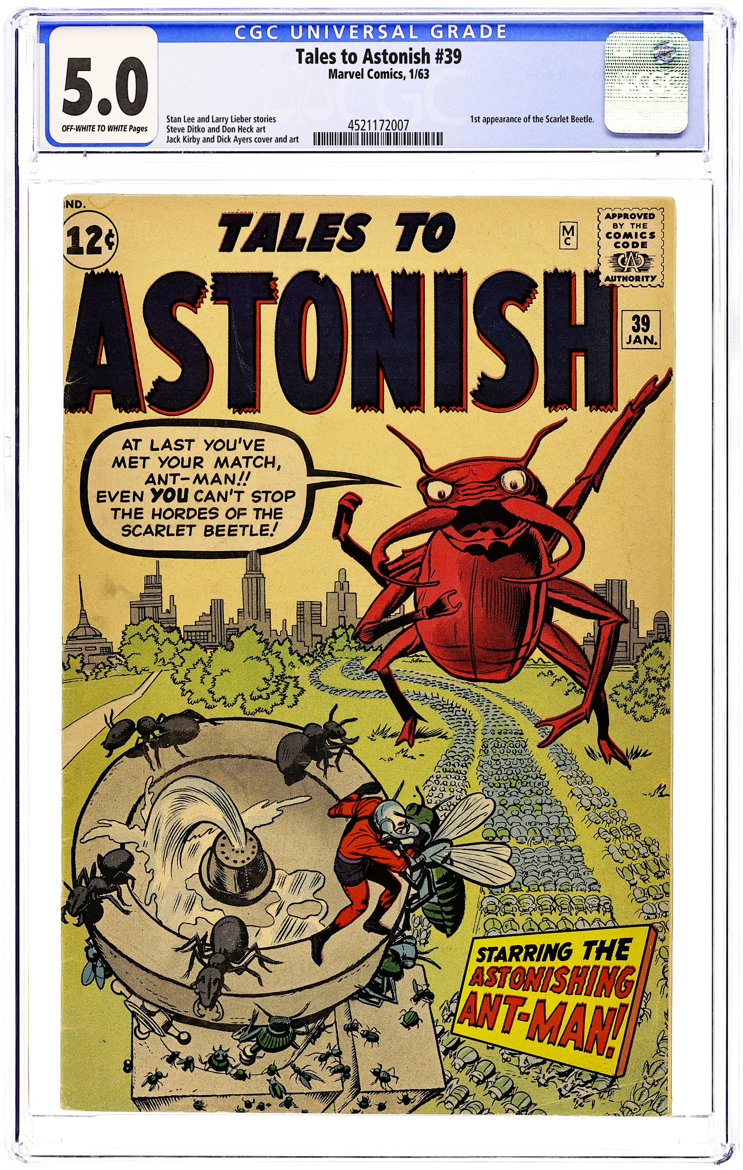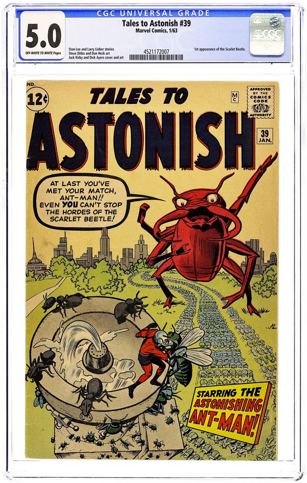 Ended Jul 16 2025 Bid History 13 bids Winning Bid $155 Cover by Jack Kirby and Dick Ayers. The Vengeance of the Scarlet Beetle!, script by Stan Lee and Larry Lieber, art by Jack Kirby and Dick Ayers; Ant-Man fights a beetle made super-intelligent by radiation. The Remedy Oil text story, art by Marie Severin. Ozamm the Terrible!, script by Stan Lee and Larry Lieber, art by Don Heck; A factory worker laid off to be replaced by a machine foils a seemingly invincible alien by cutting off his power source. The Toy Soldiers, script by Stan Lee, art by Steve Ditko; A boy who enjoys toy soldiers buys a new civil war figure to place in his prisoner of war stockade. 36 pgs., full color. $0.12. Cover price $0.12. Grade: CGC 5.0 explanation of grade Condition: Used (collectible)