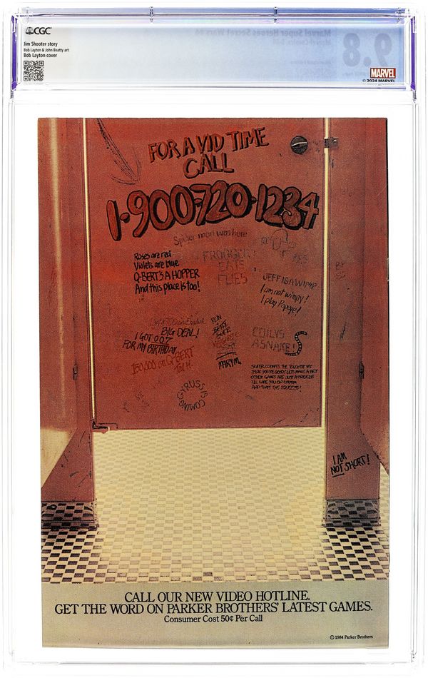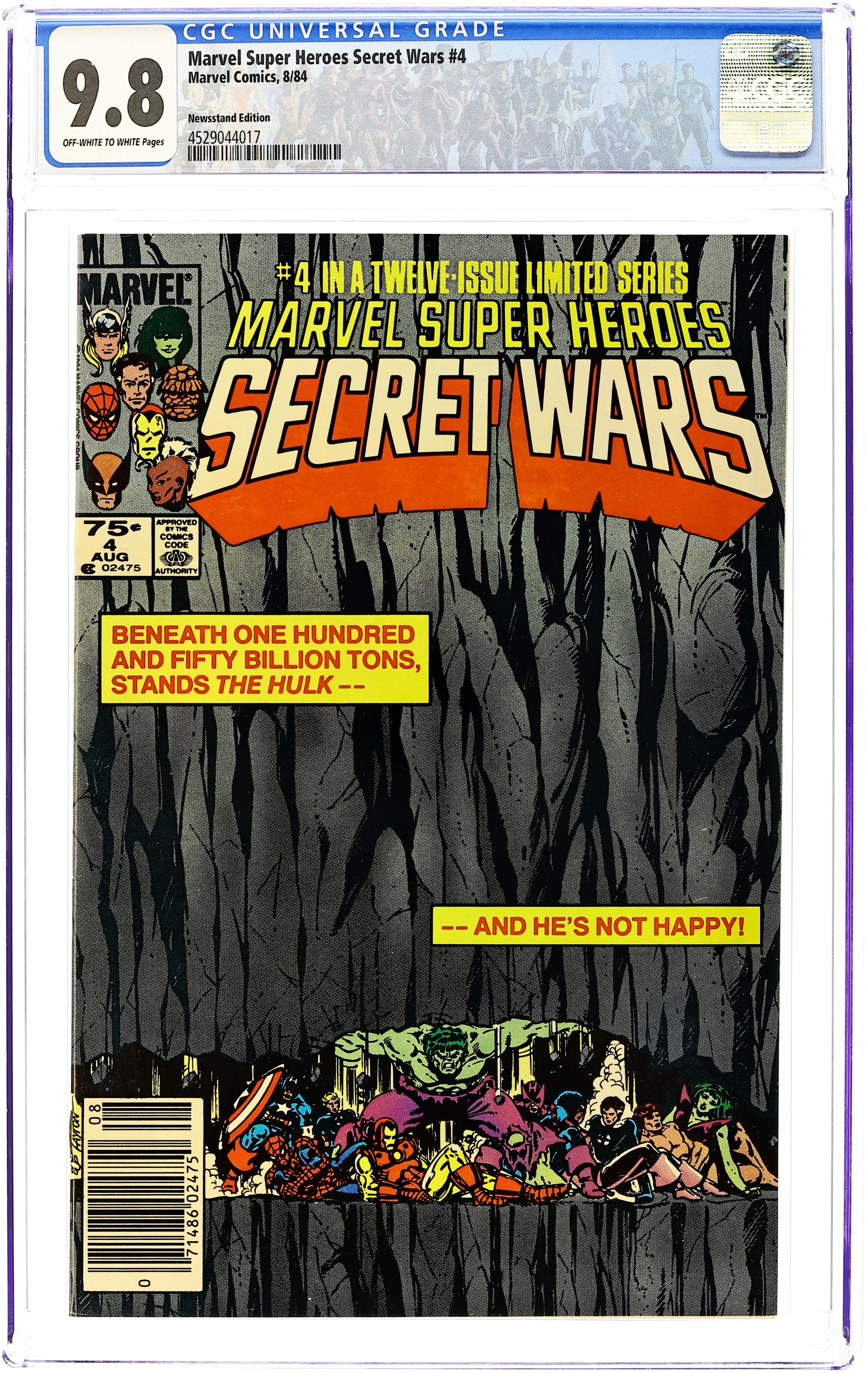 Newsstand Edition. "Situation Hopeless!" Part 4 of 12. Story by Jim Shooter. Art by Bob Layton and John Beatty. The villains' sneak attack has sent the heroes reeling. And for the coup de grace, the Molecule Man drops an entire mountain range on Captain America and his injured comrades. The only thing standing between the heroes and final oblivion is the monstrous strength of the Incredible Hulk. But, does even the Green Goliath have the strength to hold back fifty billion tons of rock and earth? Meanwhile, the X-Men seek out Magneto and the Mighty Thor stands alone against the deadliest villains in the Marvel Universe. 36 pages, full color. Cover price $0.75. Grade: CGC 9.8 explanation of grade Condition: Used (collectible)