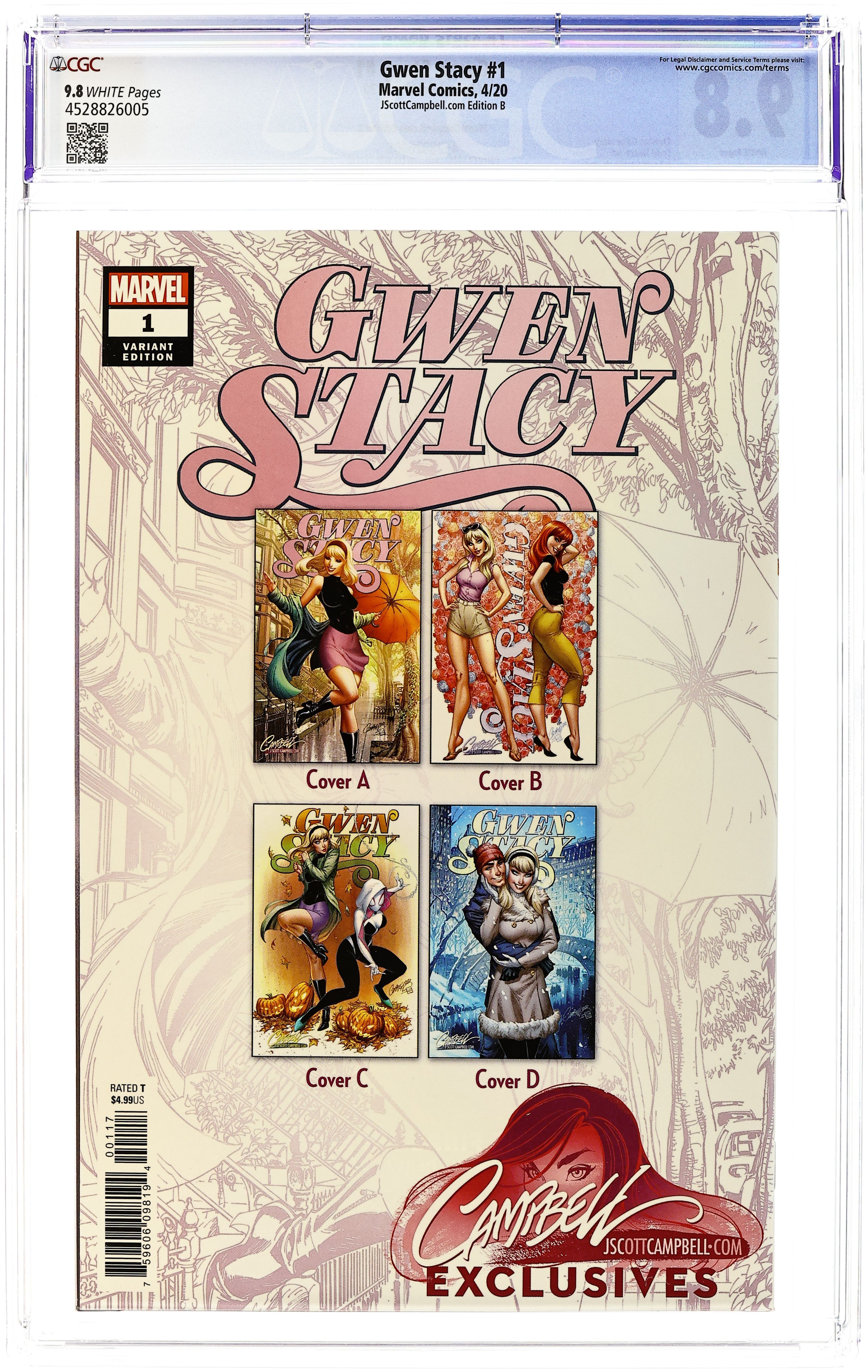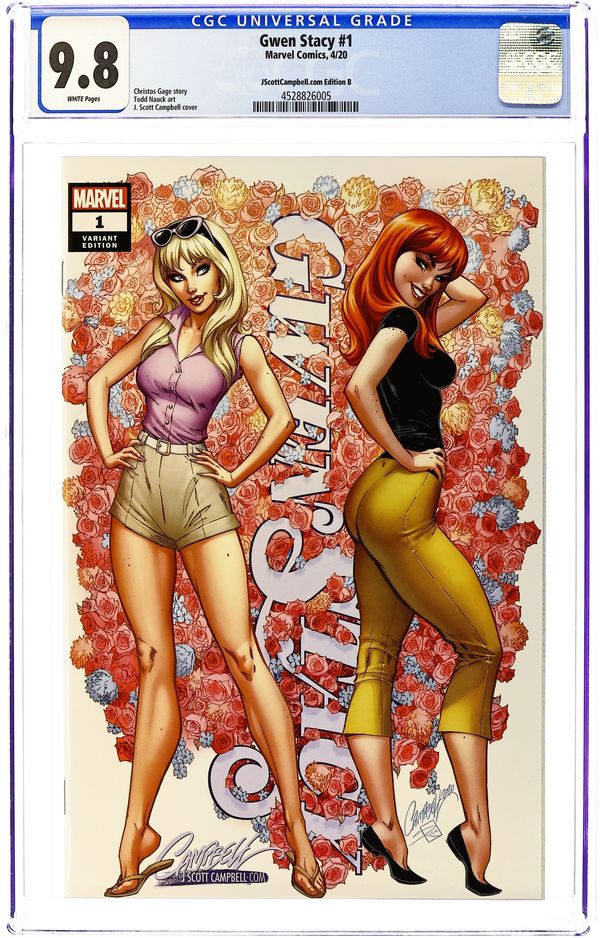 J. Scott Campbell exclusive B variant. Written by Christos N. Gage. Art by Todd Nauck. The First of Gwen Stacy's AMAZING Adventures! Gwen and Peter may not have met until AMAZING SPIDER-MAN #31, but that doesn't mean Gwen's life began on that page. Learn the never-before told origin of Gwen Stacy, top of her class, daughter of the Police Captain and, as her friend Harry Osborn calls her, 'The Beauty Queen of Standard High.' But she's way more that you even know! Gwen's got a science brain, a nose for trouble and a no-quit attitude that always gets her in trouble. In the early Marvel Universe, that's a recipe for disaster. Don't miss Gwen, Captain Stacy, Harry and Norman Osborn, Crimemaster, Wilson Fisk, Jean DeWolff, Yuri Wantanabe and even Spider-Man! 36 pages, full color. Rated T Grade: CGC 9.8 explanation of grade Condition: Used (collectible)