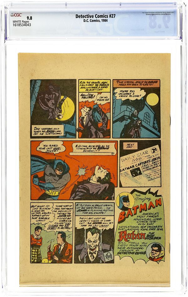 Oreo Cookie promotional comic from 1984. Reprints Batman cover and story from Detective #27, plus Robin origin from Detective #38, and first Joker appearance from Batman #1. 32-pages, all newsprint, full-color standard comic book size. Grade: CGC 9.8 explanation of grade Condition: Used (collectible)