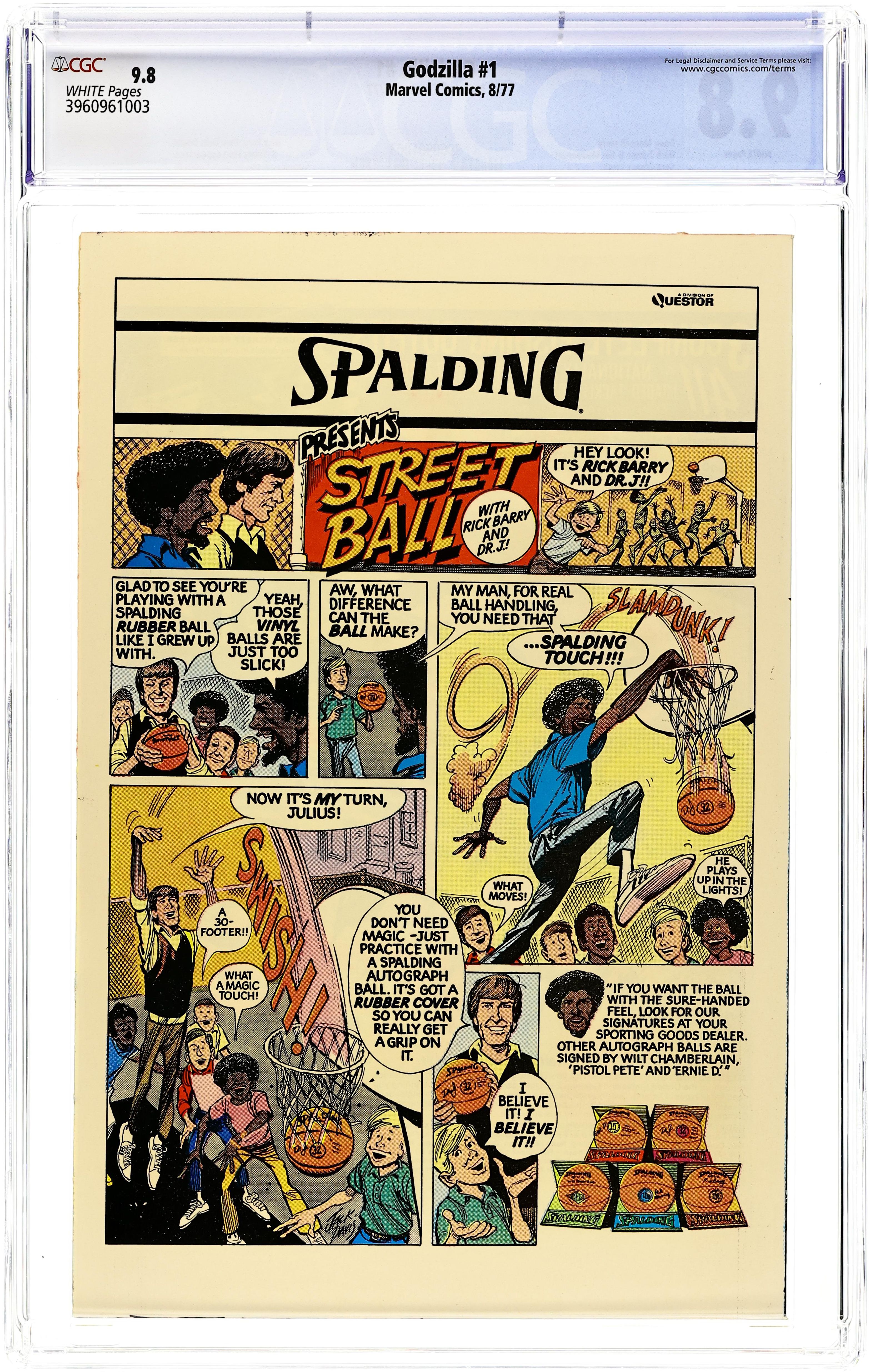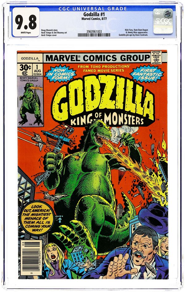 "The Coming!" Guest-starring Nick Fury and S.H.I.E.L.D. Story by Doug Moench. Art by Herb Trimpe and Jim Mooney. The slumbering leviathan known as Godzilla has awaken and rises out of the sea off the shores of Alaska. This reptilian titan has already left Japan devastated and now has made his way to America. With a tail that can smash mountains to dust and fiery breath born out of the Atomic Age, is there anything that can stop this monster's rampage? Right from the Toho Productions' famed movie series comes Godzilla, King of the Monsters. Cover price $0.30. Grade: CGC 9.8 explanation of grade Condition: Used (collectible)
