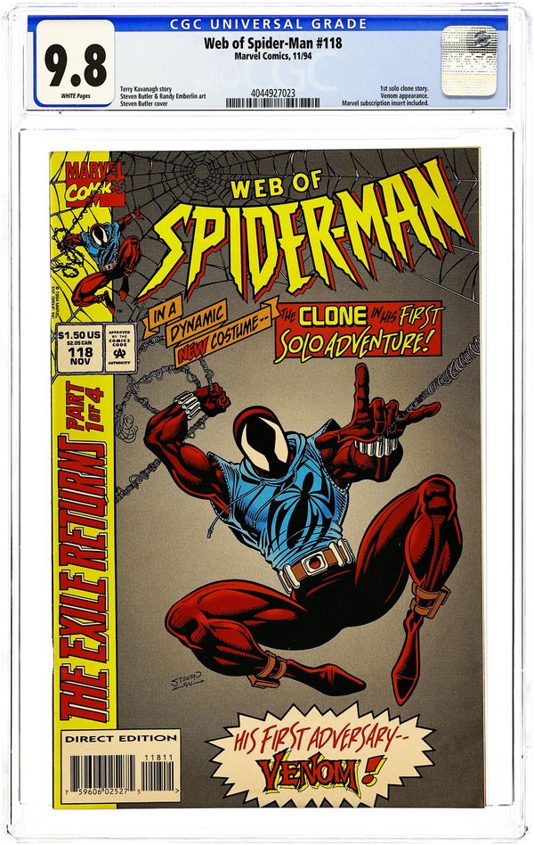 First Printing. Direct Edition. "Exiles Return Part 1 of 4: Memories" Written by Terry Kavanagh. Pencils by Steve Butle. Inks by Randy Emberlin. Venom and Clone appear. Note: First appearance of Ben Reilly as the Scarlet Spider. Cover price $1.50. Grade: CGC 9.8 explanation of grade Condition: Used (collectible)