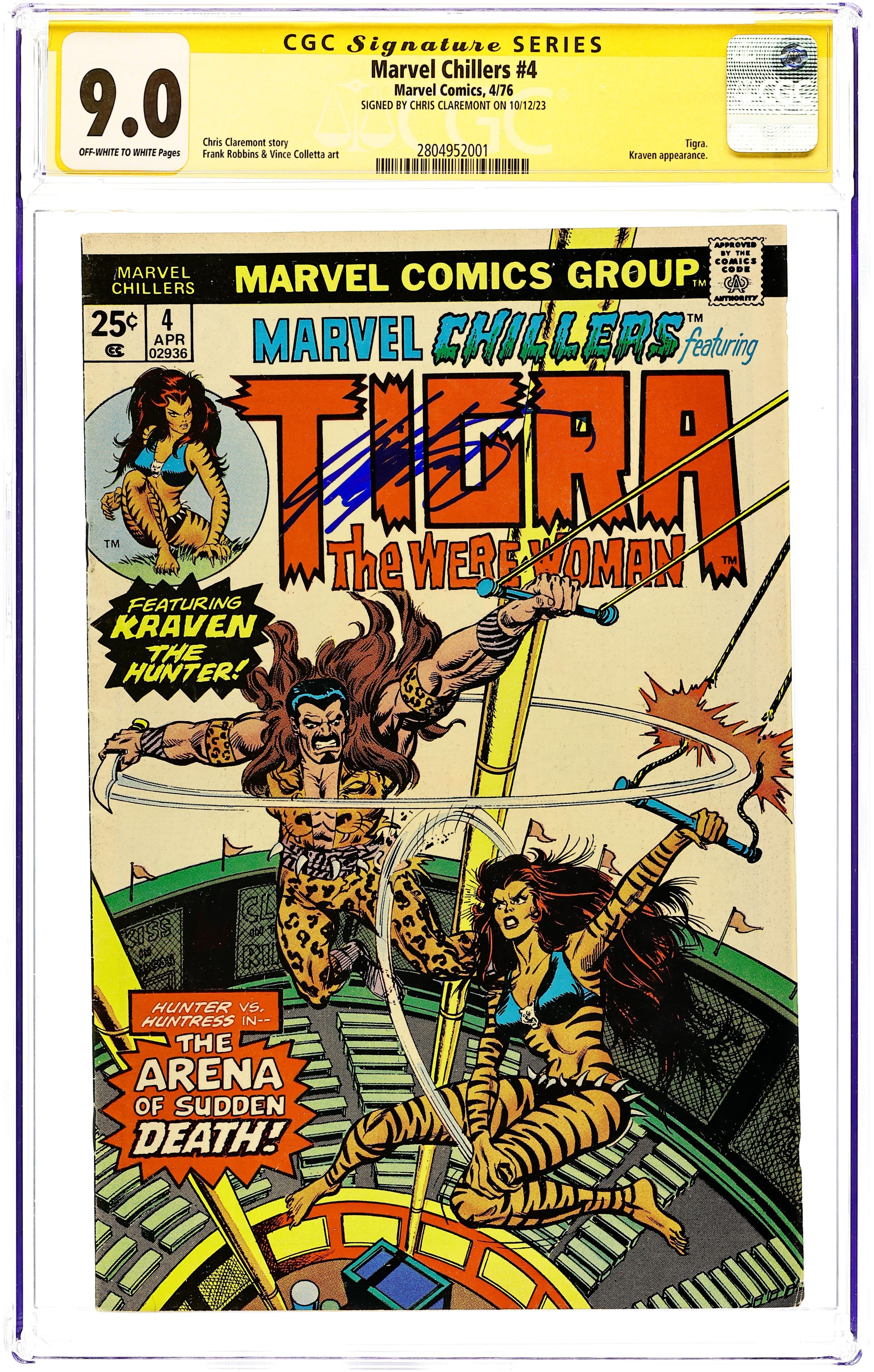 25 cent edition. Night of the Huntress! - Written by Chris Claremont. Art by Frank Robbins and Vince Colletta. Cover by unknown, Tom Palmer and John Romita, Sr. (alterations). Featuring Kraven the Hunter taking on Tigra! It's hunter vs. huntress in the arena of sudden death! 32 pages, full color. Cover price $0.25. Grade: CGC 9.0 explanation of grade Condition: Used (collectible)