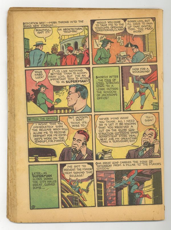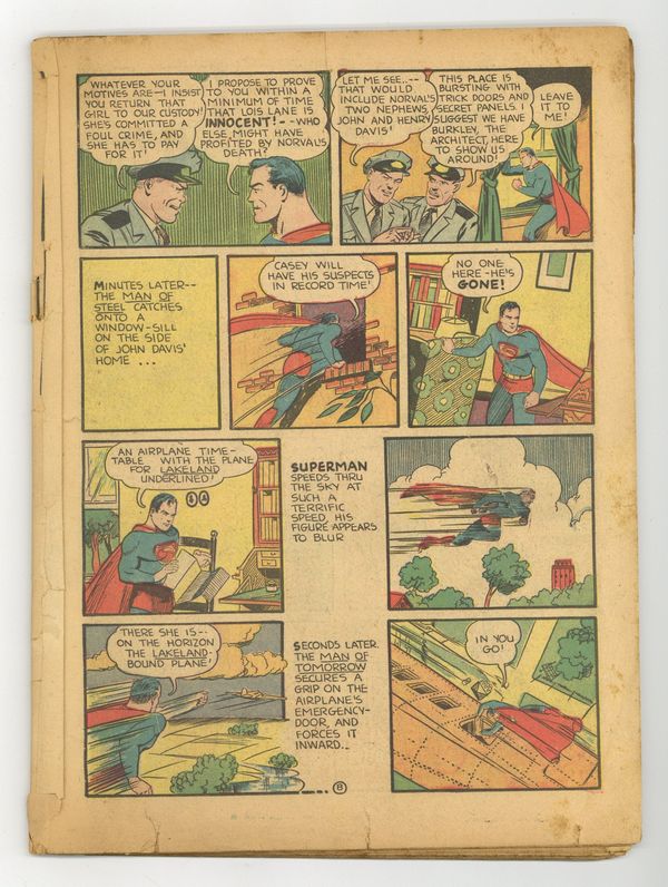 Cover pencils by Joe Shuster, inks by Paul Cassidy. Features the 1st splash page in a superman comic. Untitled Superman story, script by Jerry Siegel, art by Paul Cassidy [as Joe Shuster]; When Lois is found at the scene of the murder of a noted jewel collector, she is arrested for that murder. Supermen of America club info. Too Big For Marbles text story, script by George Shute, art by Don Komisarow. Untitled Superman story, script by Jerry Siegel, art by Paul Cassidy [as Joe Shuster]; Brute Bashby and his thugs roll into the town of Gateson with the sole purpose of establishing a protection racket, which means each shop owner must fork over 10% of their profits. Super Strength activity page, script by Jerry Siegel, art by Jack Burnley. Untitled Superman story, script by Jerry Siegel, pencils by Paul Cassidy [as Joe Shuster], inks by Cassidy and Paul Lauretta [both as Joe Shuster]; Relief efforts to help the tornado and earthquake ravaged South American nation of San Caluma head out by boat hit a snag when an aircraft carrying the relief commission officials nearly crashes. The Strangest Case text story, script by Gardner F. Fox, art by Don Komisarow. Sports Close-Ups! fact page by Jack Burnley. Untitled Superman story, script by Jerry Siegel, pencils by Paul Cassidy [as Joe Shuster], inks by Cassidy and Paul Lauretta [both as Joe Shuster]; When a department store collapses and the head of the construction firm that erected it is slain, Clark Kent smells a story in the making. 68 Pages, Full Color. Cover price $0.10. Grade: Coverless explanation of grade Condition: Used (collectible)