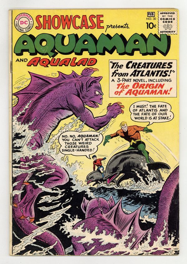 Cover pencils by Dick Dillin, inks by Sheldon Moldoff. The Creatures from Atlantis starring Aquaman and Aqualad, script by Jack Miller, art by Ramona Fradon; Aquaman gets an S.O.S. from Atlantis; Aquaman is captured, but he learns the plans of the Amphibious Aliens. The Battle of the Sea Creatures starring Aquaman and Aqualad, script by Jack Miller, art by Ramona Fradon; Aquaman and Aqualad stop amphibious aliens and force them back to their own dimension. 36 Pages, Full Color. Cover price $0.10. Grade: GD 2.0 explanation of grade Condition: Used (collectible)