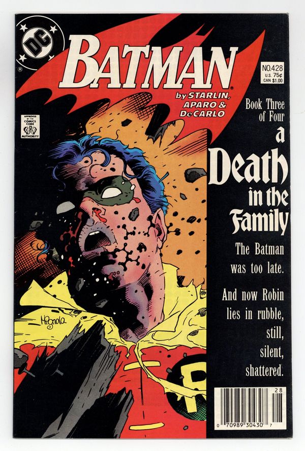 First printing. Newsstand Edition. Cover art by Mike Mignola. "A Death in the Family" part 3 of 4, script by Jim Starlin, pencils by Jim Aparo, inks by Mike DeCarlo; Death of Sheila Haywood; Burial of Sheila Haywood and Jason Todd; The Joker becomes the Iranian Ambassador to the U.N. Results of Phone Poll as to whether Robin dies this issue or not. NOTE: Most issues from 397-432 were reprinted in 1989 and sold in multipacks. These 2nd and 3rd prints have back cover ads dated 1989. 36 Pages, Full Color. Cover price $0.75. Grade: FN+ 6.5 explanation of grade Condition: Used (collectible)