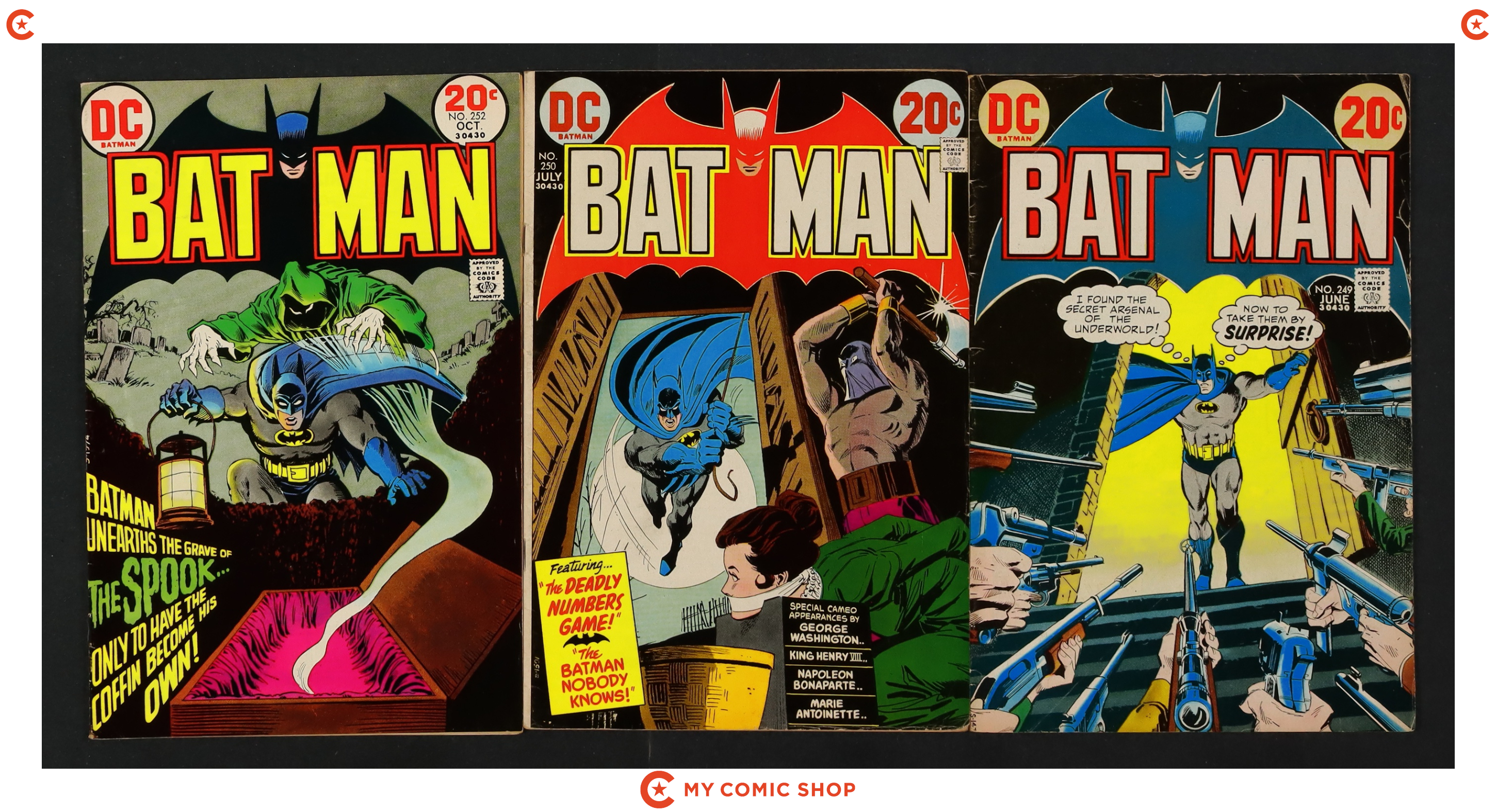 Issues 233, 238, 243, 245, 247-250, and 252 of Batman (1940). Most will grade in the VG to GD range.