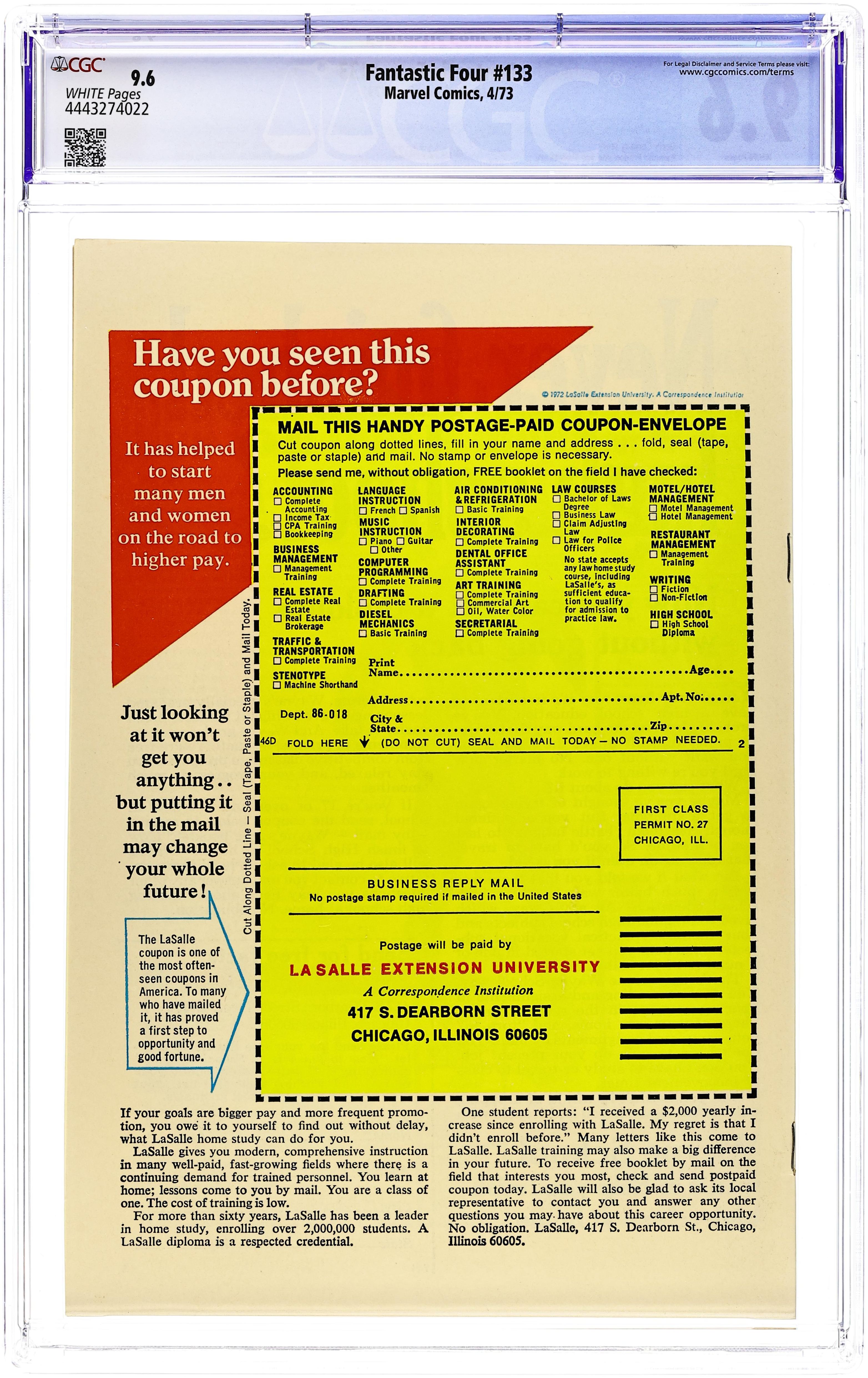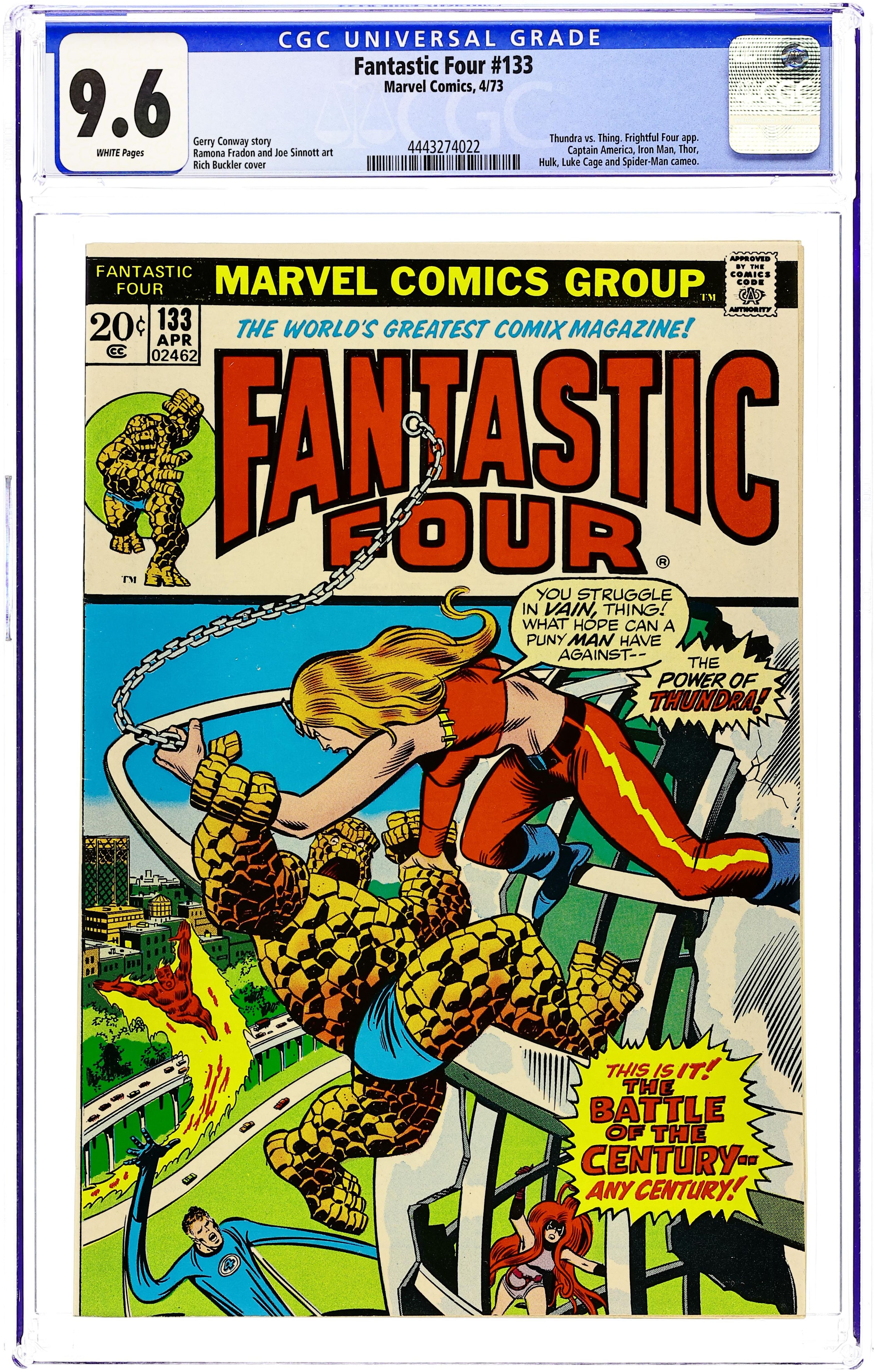 "Thundra at Dawn!" Guest-starring Thundra. Plot by Roy Thomas. Script by Gerry Conway. Pencils by Ramona Fradon. Inks by Joe Sinnott. Cover by John Buscema and Joe Sinnott. It's New Year's Eve in Times Square! Everyone is in a celebratory mood, except the Fantastic Four. Affairs of the heart are plaguing both Reed and Johnny, while Ben and his girlfriend Alicia are doing great! However, the Thing's fortunes change in a New York minute, when Thundra dramatically reappears at the stroke of midnight, challenges Ben to a fight, and kidnaps Alicia! What a set of revoltin' developments! The colossal confrontation between the two mighty warriors begins at Shea Stadium and ends at the Unisphere (from the 1964 World's Fair)! Can the blue-eyed idol of millions find the inner strength to bring down (the) Thundra? Cameo appearances by Captain America, the Hulk, Iron Man, Power Man, Spider-Man, Thor, Sandman, Trapster, and Wizard. (Notes: This is one of the very few issues that Ramona Fradon drew for Marvel. Gerry Conway begins his 20-issue scripting run on the Fantastic Four series. Thundra appears next in Giant-Size Super-Stars 1.) 36 pages Cover price $0.20. Grade: CGC 9.6 explanation of grade Condition: Used (collectible)