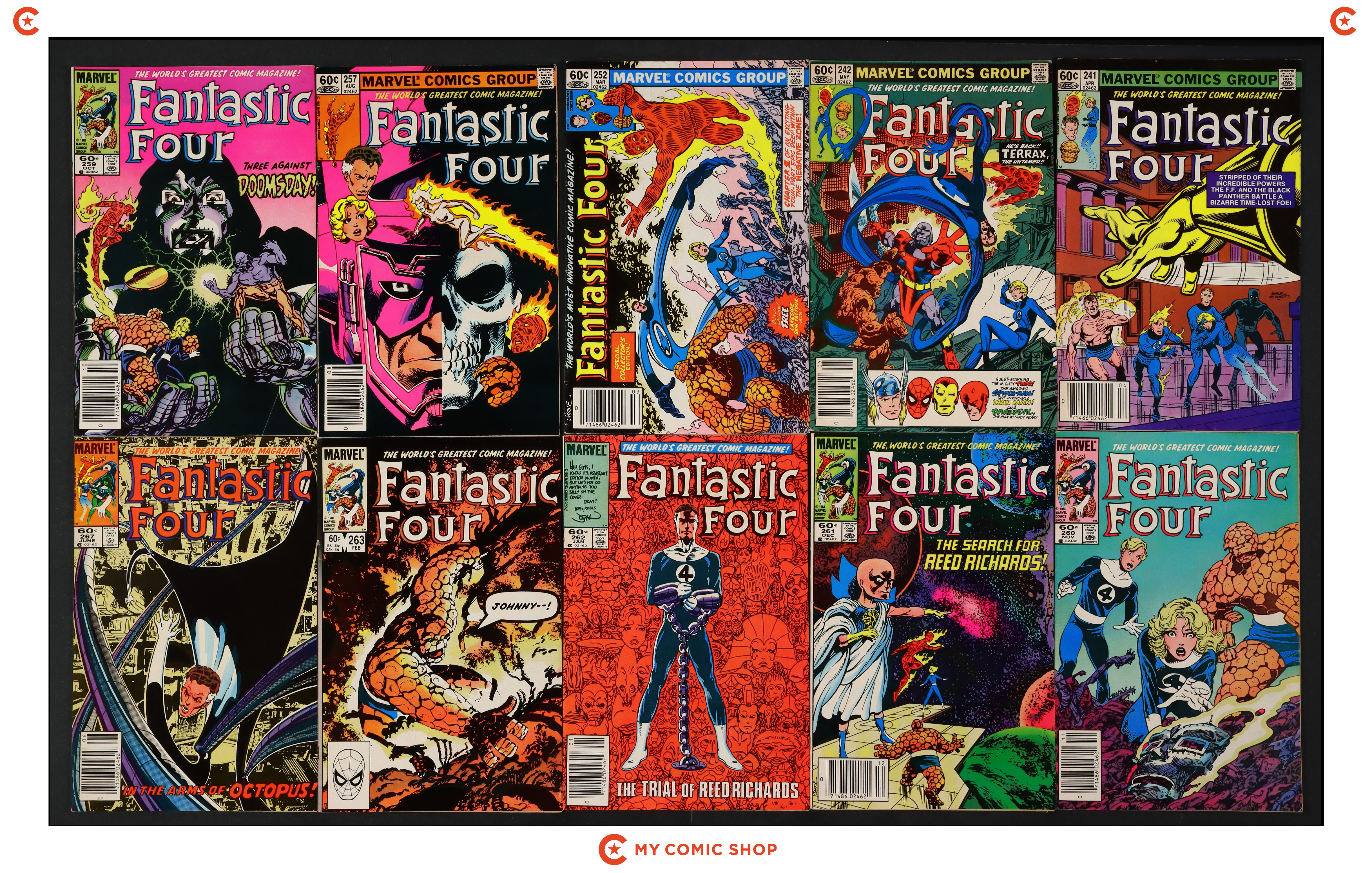 Issues 241N, 242, 252B, 257N, 259, 260N, 261, 262, 263, 267, 273, 276N, 278, 279 of Fantastic Four (1961 1st Series). Most will grade in the VG/FN to FN/VF range, with 252 and 259 grading at GD/VG.