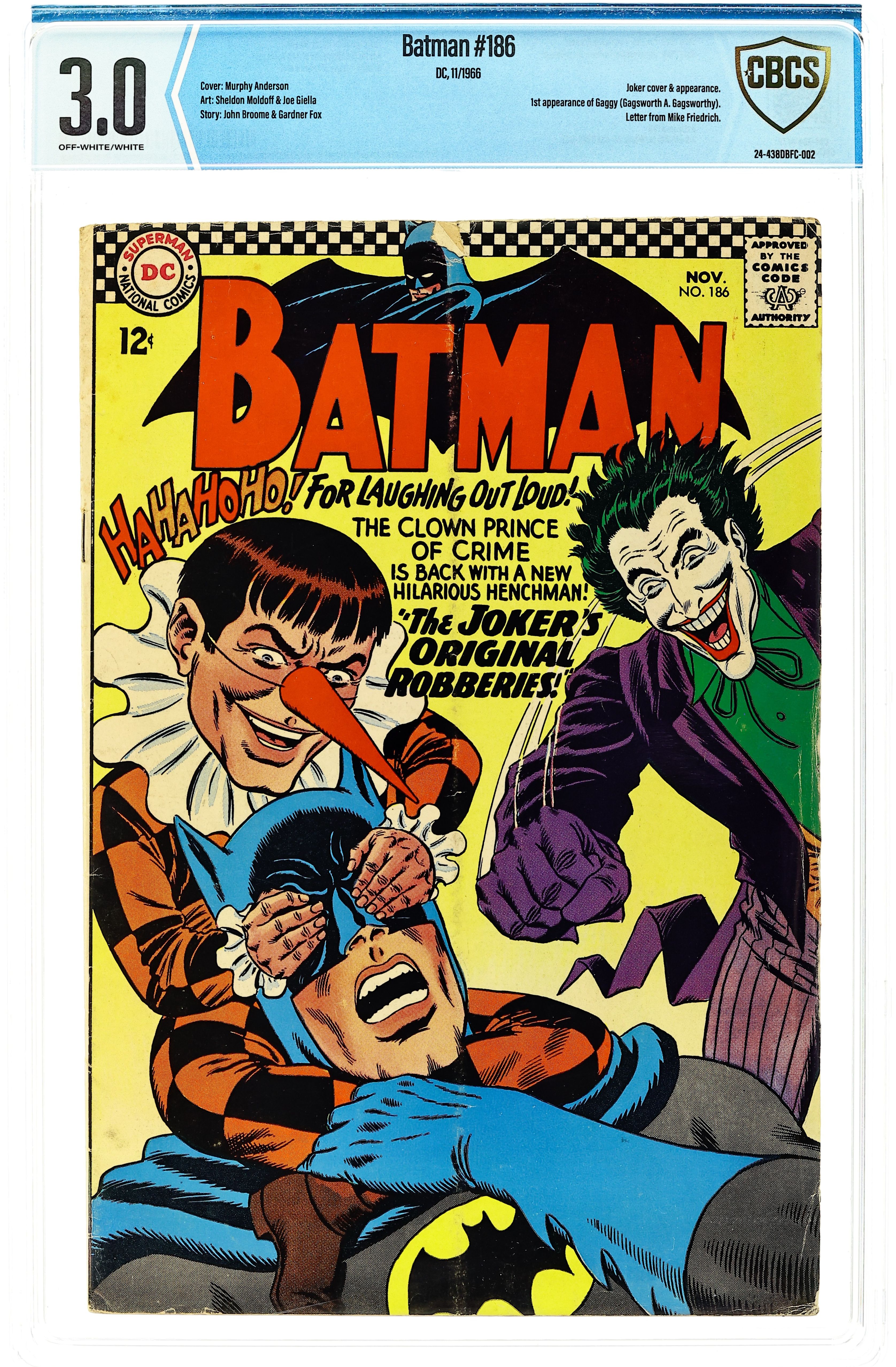 Ended May 8 2025 Winning Bid $76 Cover by Murphy Anderson. "The Joker's Original Robberies!", script by John Broome, pencils by Sheldon Moldoff (as Bob Kane), inks by Joe Giella; The Joker returns to haunt the Caped Crusaders, this time with a new member added to his gang: Gaggy, who makes the Joker laugh, which then inspires the Clown Prince of Crime with new crime ideas. Lost--A Free Education! public service announcement with Binky, art by Bob Oksner. Cap's Hobby Hints activity half-page by Henry Boltinoff. Letter from future comics writer Mike Friedrich. "Commissioner Gordon's Death-Threat!", script by Gardner Fox, pencils by Sheldon Moldoff (as Bob Kane), inks by Joe Giella; Batman receives a call from Commissioner Gordon, informing him that Fred Purley (whom Gordon helped jail) has been paroled, and has made threats against the Commissioner; The Caped Crusader heads out to protect Gordon, not realizing that Gordon has been kidnapped and Purley has set a trap awaiting Batman. Letter to the editor from comics writer Mike Friedrich. 36 Pages, Full Color. Cover price $0.12. Grade: CBCS 3.0 explanation of grade Condition: Used (collectible)