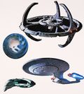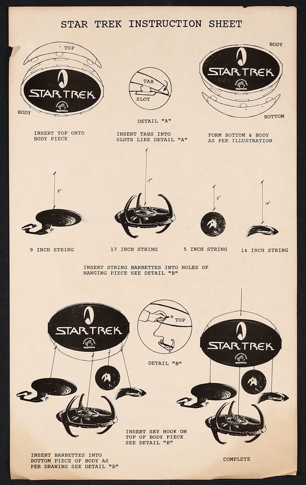 Includes cutouts of the USS Enterprise (NCC-1701-D), Deep Space Nine, a Romulan D'deridex class ship, and the Bajoran Wormhole as well as the Star Trek Logo base piece and assembly instructions. Logo base piece measures approximately 19" x 12". NOTE: This listing is for a sealed package containing the mobile parts. The images of the assembled mobile and unassembled parts are for reference. Sealed packages are assumed to be complete.