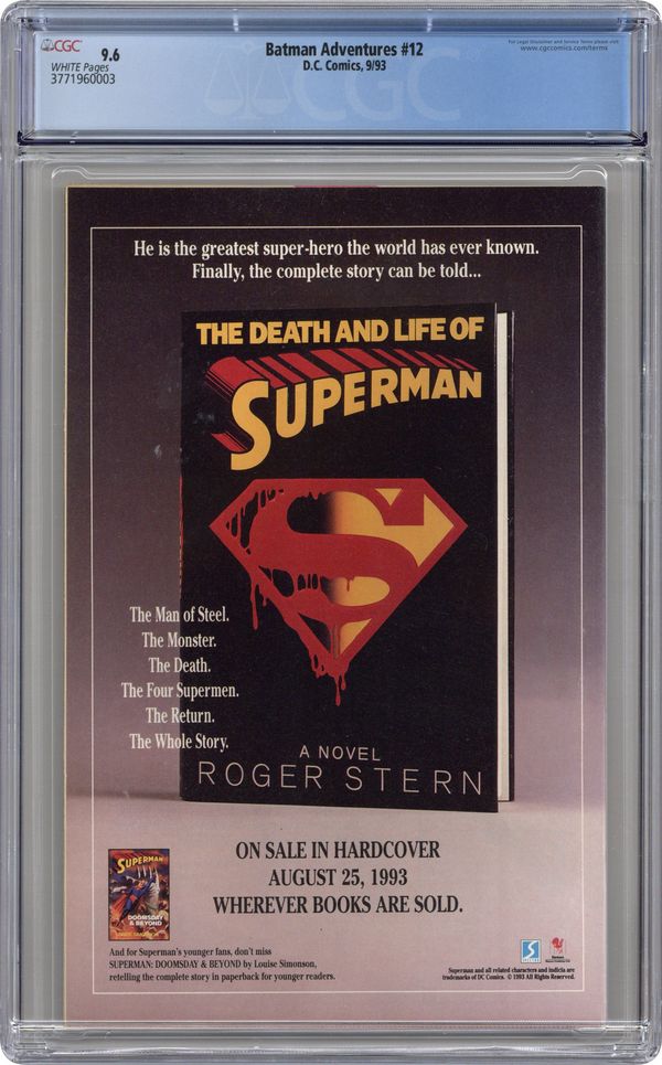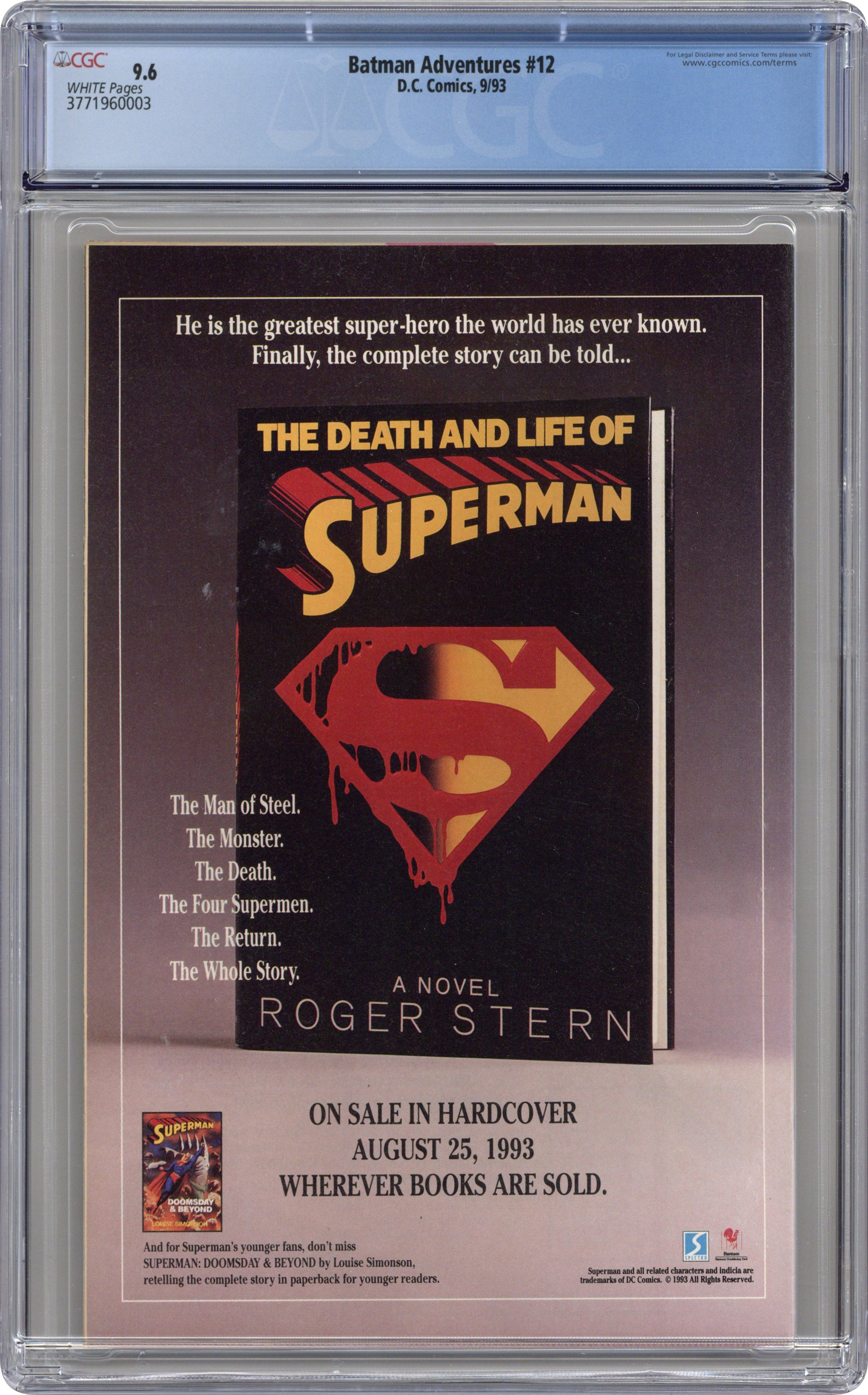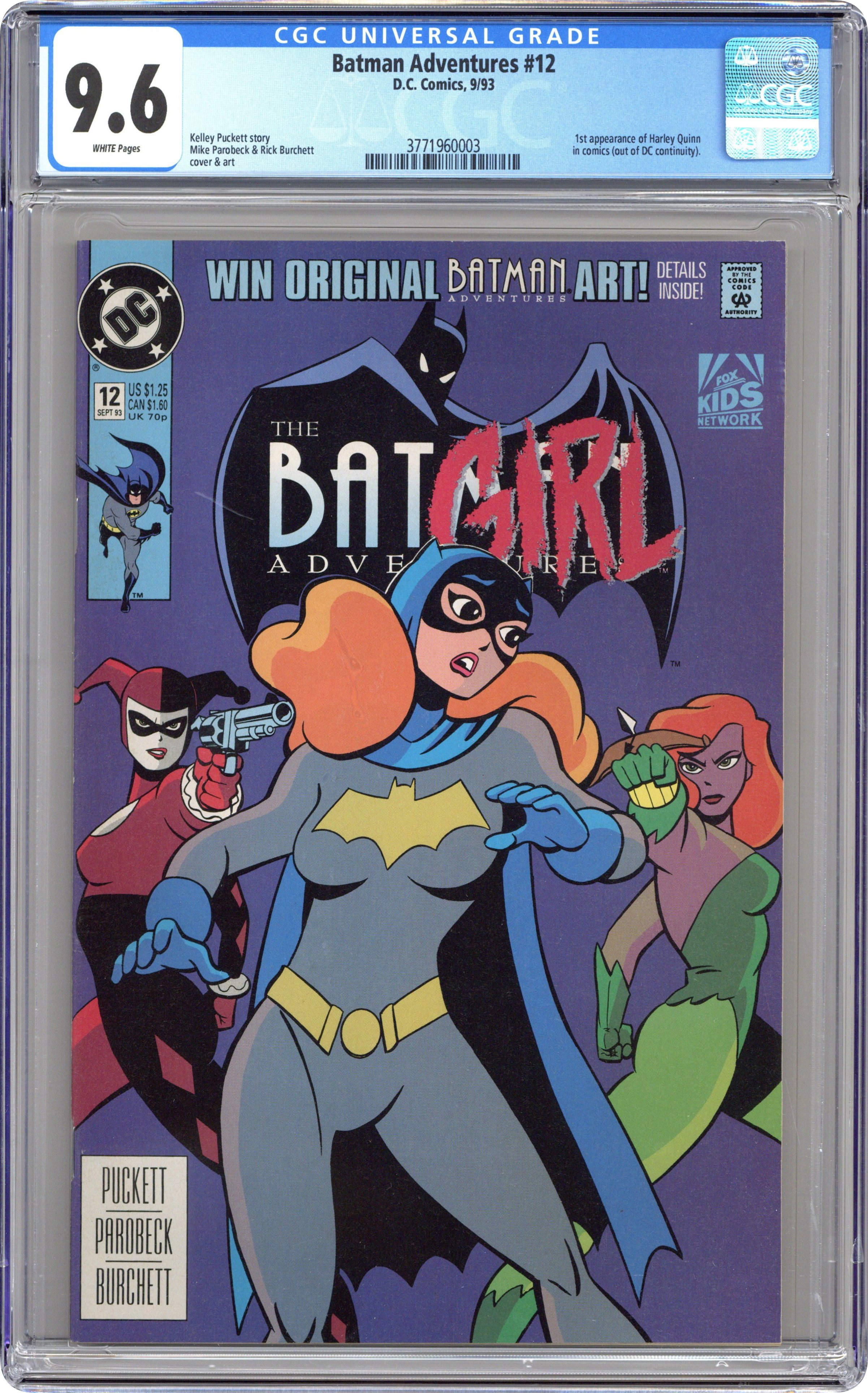 Direct Edition. 1st appearance of Harley Quinn in a comic book. "Batgirl: Day One." Barbara Gordon attends a costume party dressed as Batgirl. Unfortunately, Poison Ivy and Harley Quinn also decide to show up. Based on Batman The Animated Series. Script by Kelley Puckett, pencils by Mike Parobeck, inks by Rick Burchett. Cover by Parobeck. Cover price $1.25. Grade: CGC 9.6 explanation of grade Condition: Used (collectible)