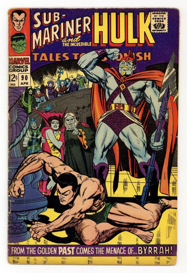 Cover by Jack Kirby and Vince Colletta. To Be Beaten by Byrrah!, script by Stan Lee, art by Bill Everett and Marie Severin; Namor's cousin wins the favor of the populace of Atlantis as well as the Atlantean council by belittling the regime of the Sub-Mariner as violent and unstable; He challenges Namor to single combat for the right to rule and no one is more surprised than the avenging son when his powers desert him during the fight and Byrrah handily wins. The Abomination!, script by Stan Lee, art by Gil Kane; The Stranger leaves earth with the rampaging Hulk left behind to wreak destruction on his behalf; Turning back into his alter ego, Banner surrenders himself to Gamma base and tries to kill himself with radiation to stop the Hulk's destruction; Stopped before he can use his gamma machine, the machine is instead used by a foreign spy who is transformed into the Abomination; More powerful than even the Hulk, Abomination beats the jade giant down and kidnaps Betty as he escapes from the base. Letter from Bill Mantlo. 36 pgs., full color. $0.12. Cover price $0.12. Grade: GD 2.0 explanation of grade Condition: Used (collectible)