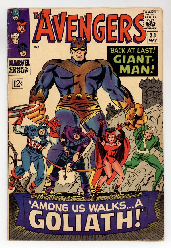 Ended Jun 6 2025 Winning Bid $35 Cover pencils by Jack Kirby, inks by Frank Giacoia. Giant-Man becomes Goliath and, along with the Wasp, rejoins the Avengers in "Among Us Walks... a Goliath!", script by Stan Lee, art by Don Heck; Henry Pym calls the Avengers, saying the Wasp is missing, and that he is Giant-Man; The Wasp has been captured by the Collector and the Beetle; Giant-Man renames himself Goliath; They enter the Collector's lair and get separated and captured; Goliath escapes and frees the other Avengers; They rescue the Wasp and force the Collector to escape with the Beetle using a time machine; However, when Goliath tries to shrink down to his normal size he collapses and faints at 10 feet tall; First appearance of The Collector. Avengers roll call: Captain America, Hawkeye, Quicksilver, and the Scarlet Witch. Reprinted in Marvel Triple Action #22. 36 pgs., full color. $0.12. Cover price $0.12. Grade: VG- 3.5 explanation of grade Condition: Used (collectible)