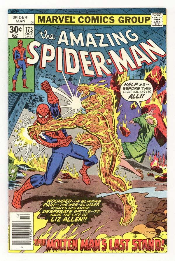 Ended May 6 2025 Winning Bid $42 "If You Can't Stand the Heat...!" Part 2 of 2. Script by Len Wein. Art by Ross Andru (breakdowns) and Jim Mooney (finishes). Cover by Ross Andru and John Romita. The Molten Man is dying! And he's going out in a blaze of glory...literally! When Mark Raxton's final attempt to cure his condition fails, he holes up in the top floor of a pharmaceutical building and demands to see his stepsister Liz Allan! Bravely Liz enters the building and so does the Amazing Spider-Man! As the Molten Man and the wall-crawler trade blows, the building becomes a raging inferno on the verge of collapse! Will anyone get out alive? An anguish-filled ending! Cameo appearances by Mary Jane Watson, Harry Osborn, and Flash Thompson. Last 30ยข issue. (Notes: The Molten Man returns in Spectacular Spider-Man 63. A limited distribution 35-cent cover price variant exists for this issue.) 36 pages Cover price $0.30. Grade: VF 8.0 explanation of grade Condition: Used (collectible)