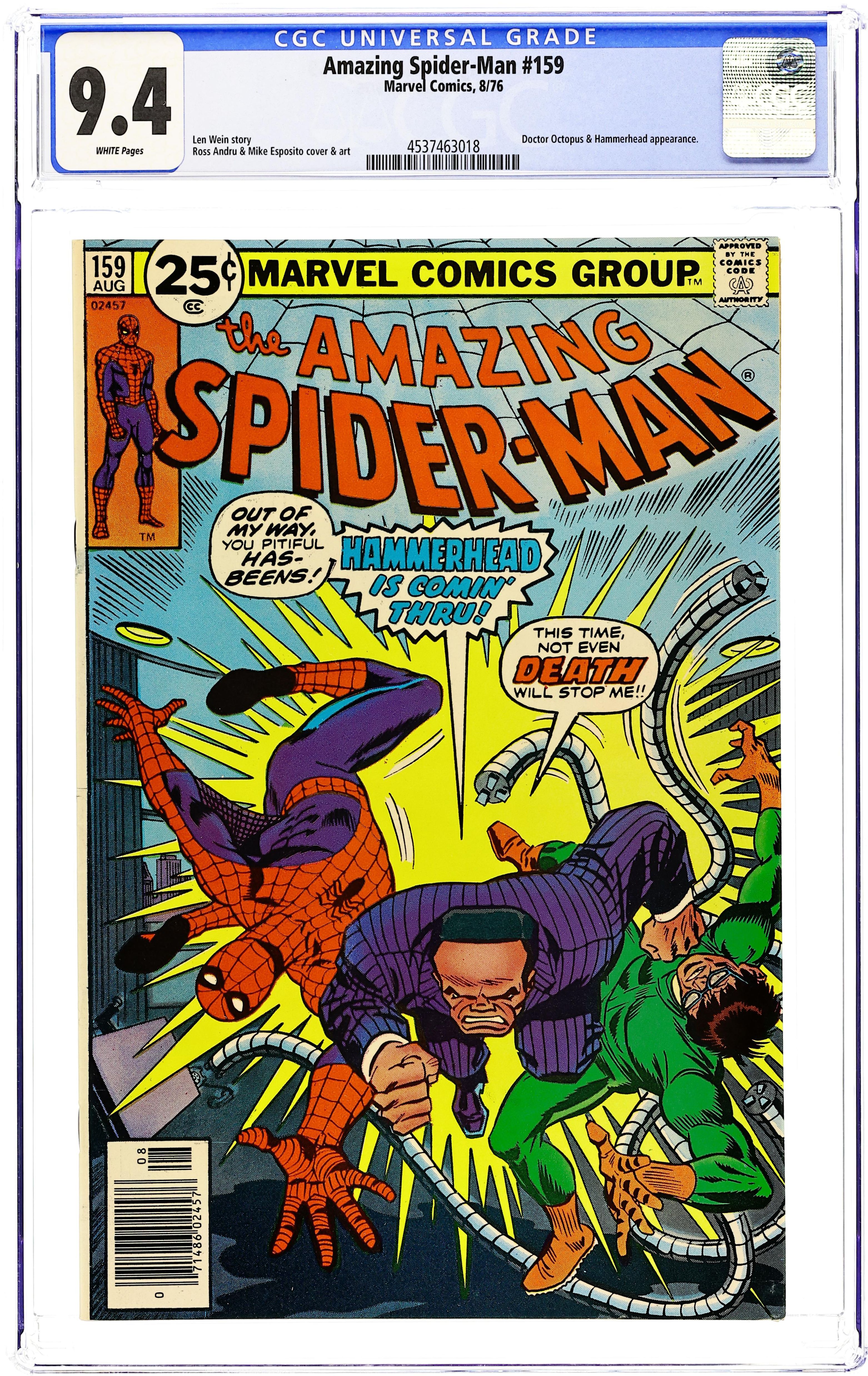 "Arm-in-Arm-in-Arm-in-Arm-in-Arm-in-Arm with Doctor Octopus!" Part 3 of 3. Script by Len Wein. Art by Ross Andru (breakdowns) and Mike Esposito (finishes). Cover by Ross Andru and Frank Giacoia (with assists from John Romita). With his dear aunt's life in jeopardy, the wondrous wall-crawler remembers that the enemy of my enemy is my friend! And in a remarkable twist of fate, the Spectacular Spider-Man and Dr. Otto Octavius team up to take down Hammerhead! The unlikely duo traps Hammerhead inside one of his old nightclubs! And then the final fireworks begin! Spidey and Doc Ock battle Hammerhead to the fateful finish! Cameo appearances by the Tinkerer, Toy, Kingpin, Joe Robertson, J. Jonah Jameson, and the Spider-Mobile. Last 25ยข issue. (Notes: Doc Ock clashes with the web-slinger again in Amazing Spider-Man Annual 13. Hammerhead returns in Fantastic Four 233. This story was reprinted in Marvel Tales 136. A 30-cent cover price variant exists for this issue.) 36 pgs. Cover price $0.25. Grade: CGC 9.4 explanation of grade Condition: Used (collectible)