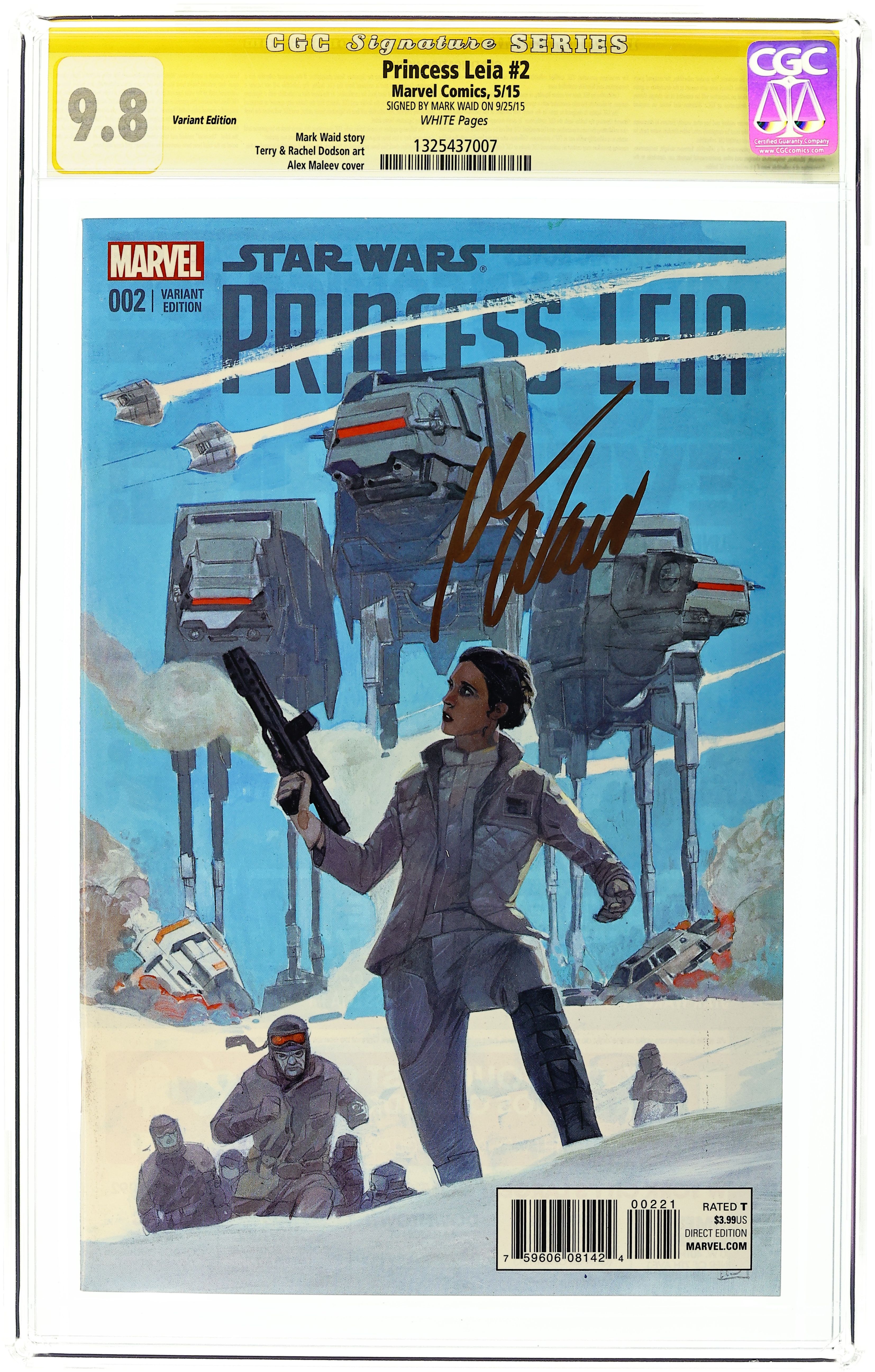 Limited 1 for 25 Retailer Incentive Variant Cover. Written by Mark Waid. Art by Terry Dodson. Cover Alex Maleev. When Princess Leia Organa was captured by the Empire as a Rebel spy, she never betrayed her convictions, even in the face of the complete destruction of her home world, Alderaan. When her rescue came, she grabbed a blaster and joined the fight, escaping back to the Rebel Alliance and helping strike the biggest blow against the Empire-the destruction of the Death Star. But in the aftermath of that victory, the question remains...what is a princess without a world? 28 pages, full color. Rated T Cover price $3.99. Grade: CGC 9.8 explanation of grade Condition: Used (collectible)