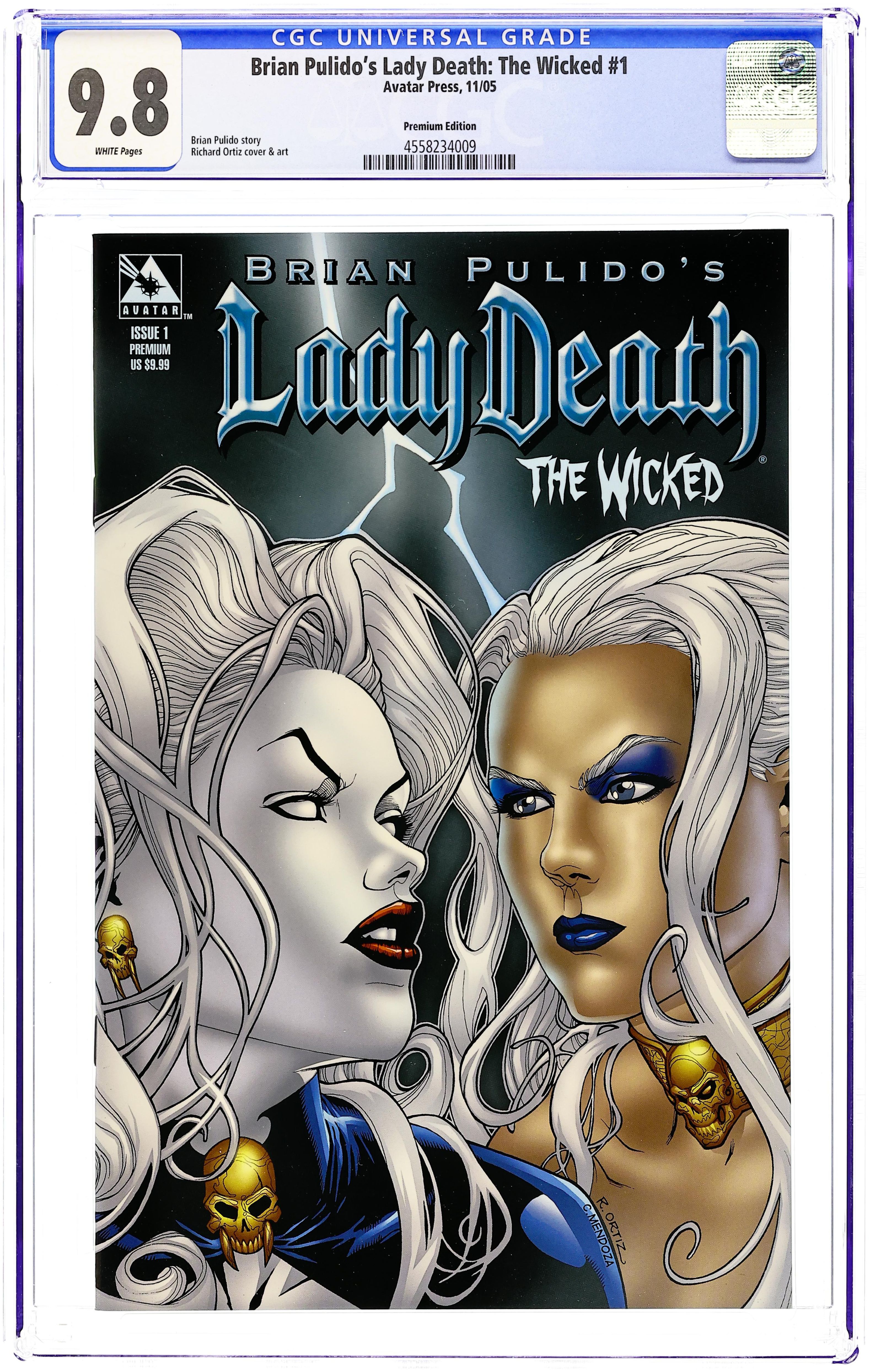 Ended Jul 17 2025 Winning Bid $28 Premium variant cover by Richard Ortiz. Brian Pulido writes Lady Death: The Wicked, the big breakout book for sultry talent Richard Ortiz and his Mucha-Esq art nouveau style! Lady Death has been whisked away by the all-new, diabolical, Goth villain Pariah. She is magically moved from one impossible battle to another, all at the whims of Pariah. As the foes continue to overwhelm her, Lady Death begins to piece together the puzzle. The bitch goddess will not be used as a plaything and her vengeance will be mighty! 32 pages, full color. Cover price $5.99. Grade: CGC 9.8 explanation of grade Condition: Used (collectible)
