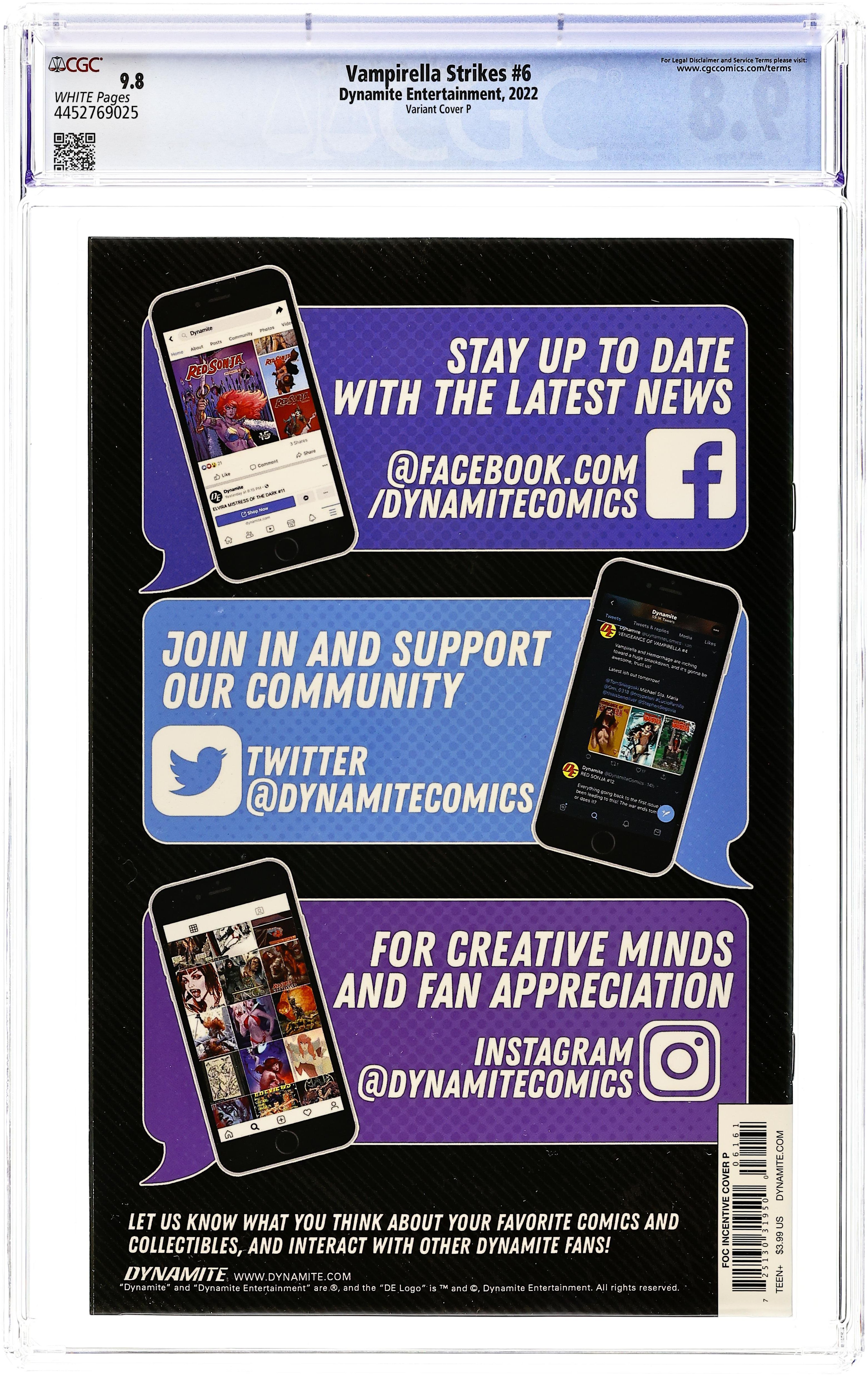 Published Oct 2022 by Dynamite Entertainment.Vampirella Strikes (2022 Dynamite) 6P CGC 9.8 Parrillo Ultraviolet Virgin 1:10 Variant