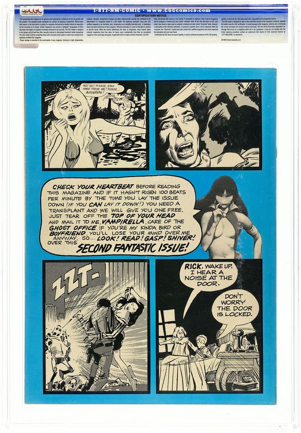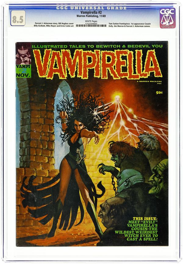 Ended Jul 22 2025 Winning Bid $251 Stories in this issue include: "Vampi's Feary Tales," "Evily" (starring Vampirella's cousin); "Montezuma's Monster"; "Down to Earth" (with cameos by Forry Ackerman and James Warren); "Queen of Horror"; "The Octopus"; "One, Two, Three" (a robot tale); and "Rhapsody in Red." Written by Forrest J Ackerman, Nicola Cuti, Don Glut, Bill Parente, and R. Michael Rosen. Art by William Barry, Ernie Colon, Billy Graham, Mike Royer, Jerry Grandenetti, Dick Piscopo, and Tony Williamsune. Cover art by Bill Hughes. 68 pages, B&W. Cover price $0.50. Grade: CGC 8.5 explanation of grade Condition: Used (collectible)
