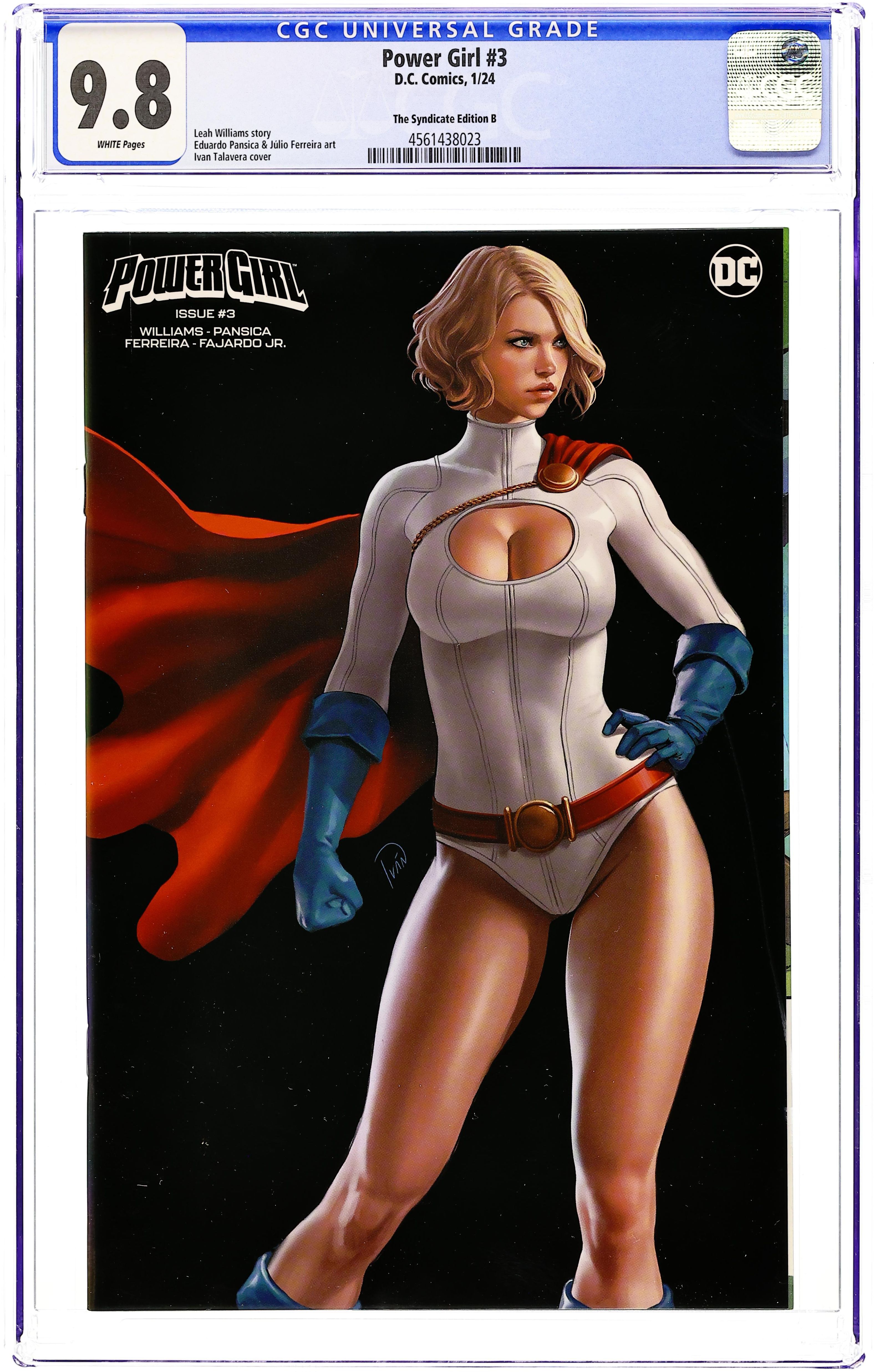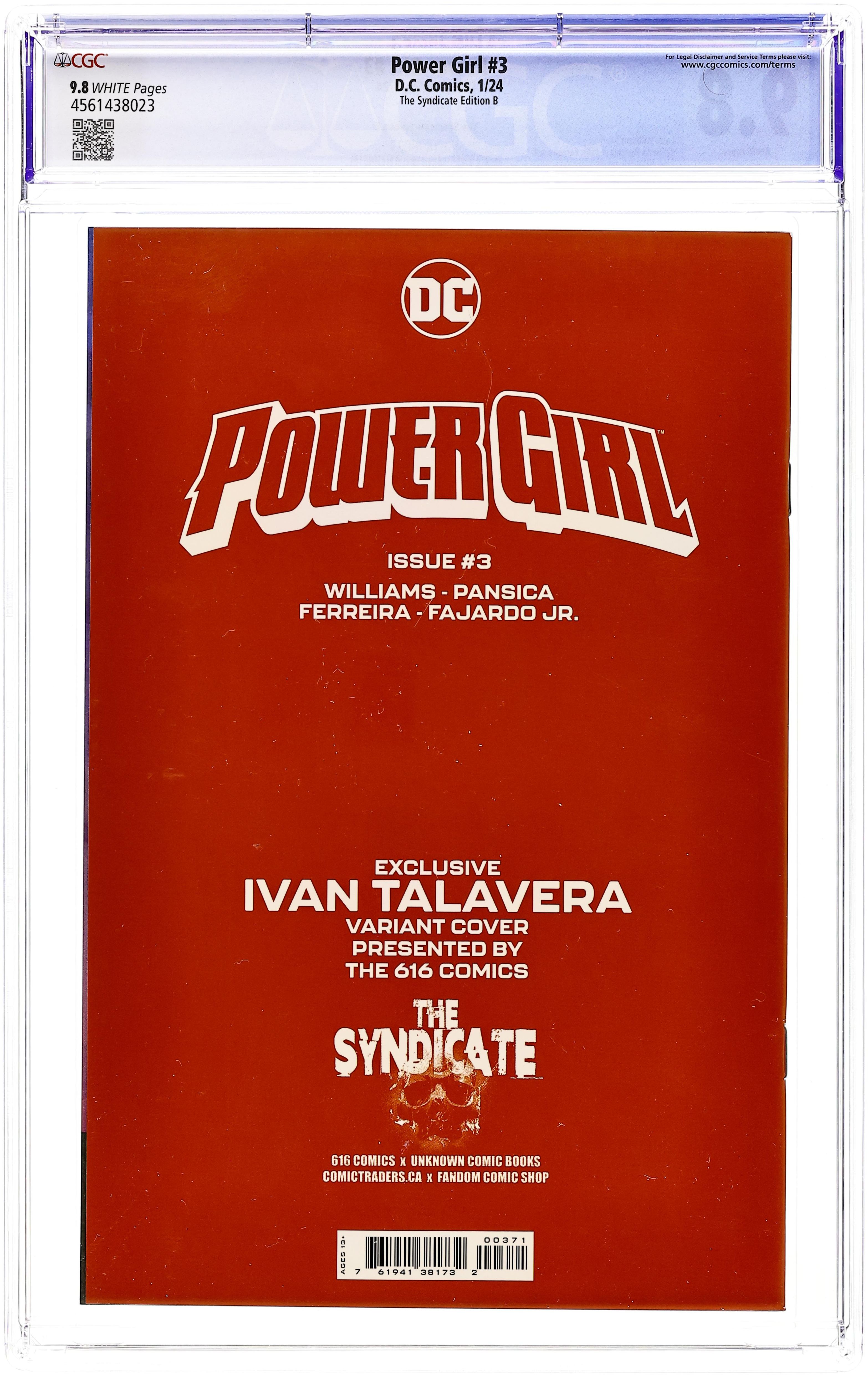 Ended Jun 15 2025 Winning Bid $76 The Syndicate (616 Comics, Unknown Comic Books, Comic Traders, and Fandom Comic Shop) Exclusive Virgin Cover by Ivan Talavera. Written by Leah Williams. Art by Eduardo Pansica. Looking for answers, Power Girl heads to Superman's Fortress of Solitude to study up on the mysterious Kryptonian virus sensation sweeping the nation. Turns out...she's not alone! Something is lurking in the shadows of the Man of Steel's most secret of headquarters, and it won't stop its hunt until it's the last one standing! 32 pages, full color. Rated T+ Grade: CGC 9.8 explanation of grade Condition: Used (collectible)