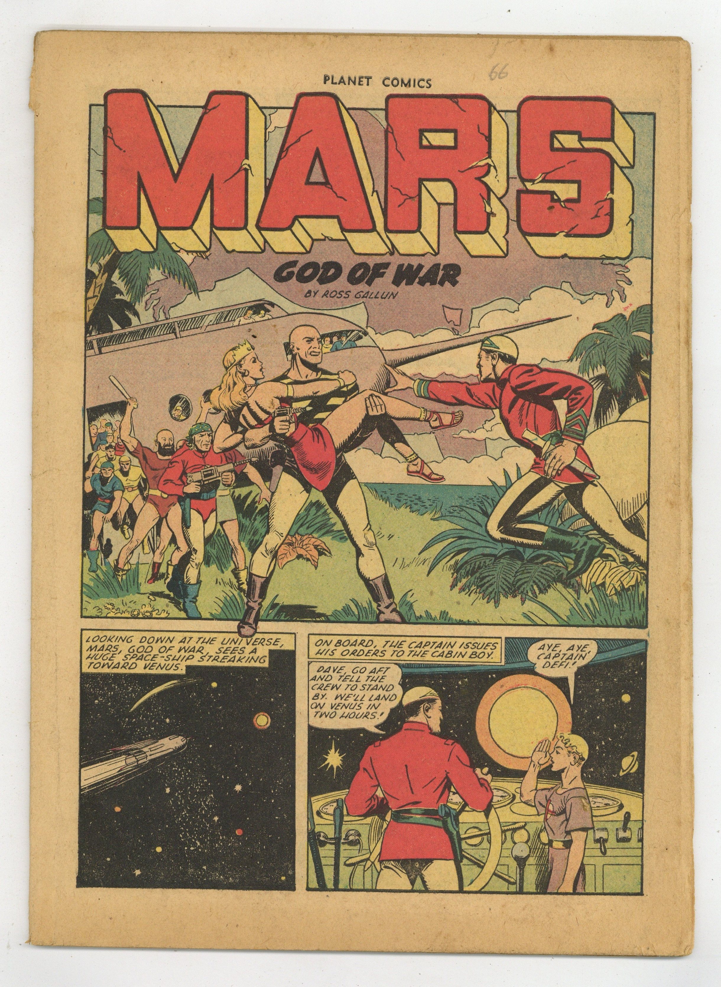 Maurice Whitman cover. Stories reprinted from Planet Comics (1940 Fiction House) #21. In order of appearance: "Mars, God of War" art by Joseph Doolin; "Gale Allen and the Girl Squadron" art by Saul Rosen; "The Lost World" art by Rudy Palais; and "Flint Baker" art by Art Saaf. 36 pages. Full color. Cover price $0.10. Grade: Coverless explanation of grade Condition: Used (collectible)