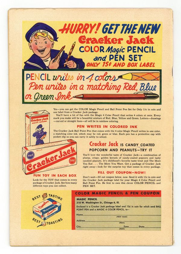 Ends Dec 8 7:32 PM CST Bid History 6 bids Current Bid $13 Your Secret Max Bid If you'd like to bid, please log in or register. "Coat of Alms," art by George Frese; Betty talks Jughead into going on a quiz show to win her a mink cape. "Sweet Talk"; Veronica suspects that Archie uses the same sweet talk on all the girls. "Date Bait," pencils by George Frese, inks by Terry Szenics; Jughead urges Betty to fight her natural urge to throw herself at Archie and play hard to get in order to lure him away from Veronica. "Polo Phony"; Veronica invites the gang over to play water polo. "Inferior Decorating," script by Frank Doyle, pencils by Dan DeCarlo, inks by Rudy Lapick; Betty and Veronica team up to keep Veronica's mantrap cousin away from Archie. "Sleigh It Isn't So" text story; Betty takes the punishment for Archie's spilling ink on Miss Grundy's desk. "Fashion Revue for Teen-ettes" with Betty and Veronica. Untitled Katy Keene story, script and art by Bill Woggon; Sis falls while ice skating and skiing. "Economically Speaking"; Fred wants to know why so much money has gone from their savings account. "Lip Service"; While Veronica is ice skating all the boys try to hit on her. "Treat 'Em Roof"; Veronica says that Archie is so infatuated with her that he'd walk off of a roof if she asked him to. "Paint Necessarily So!"; Betty gets confused by the paint instructions that say to put on two coats. "The Early Bird," art by Joe Edwards; Mr. Lodge catches Veronica sneaking in after curfew. "Pie Crust"; Wilbur tries to walk out without paying for a pie. "Catty Corner"; Veronica had a terrible time at the ski lodge but lies to Betty about how great it was. "Nose Knows"; Betty wants to trade her perfume for a cookbook because the smell of food attracts Archie more than the smell of her perfume. Ad for Archie's Joke Book #16. "Juggy's Last Stand," art by George Frese; Jughead's got a girlfriend and the girls are desperate to meet her. "Shop Talk"; Veronica buys clothes to go Christmas shopping in. 36 pgs., full color. Cover price $0.10. Grade: VG- 3.5 explanation of grade Condition: Used (collectible)