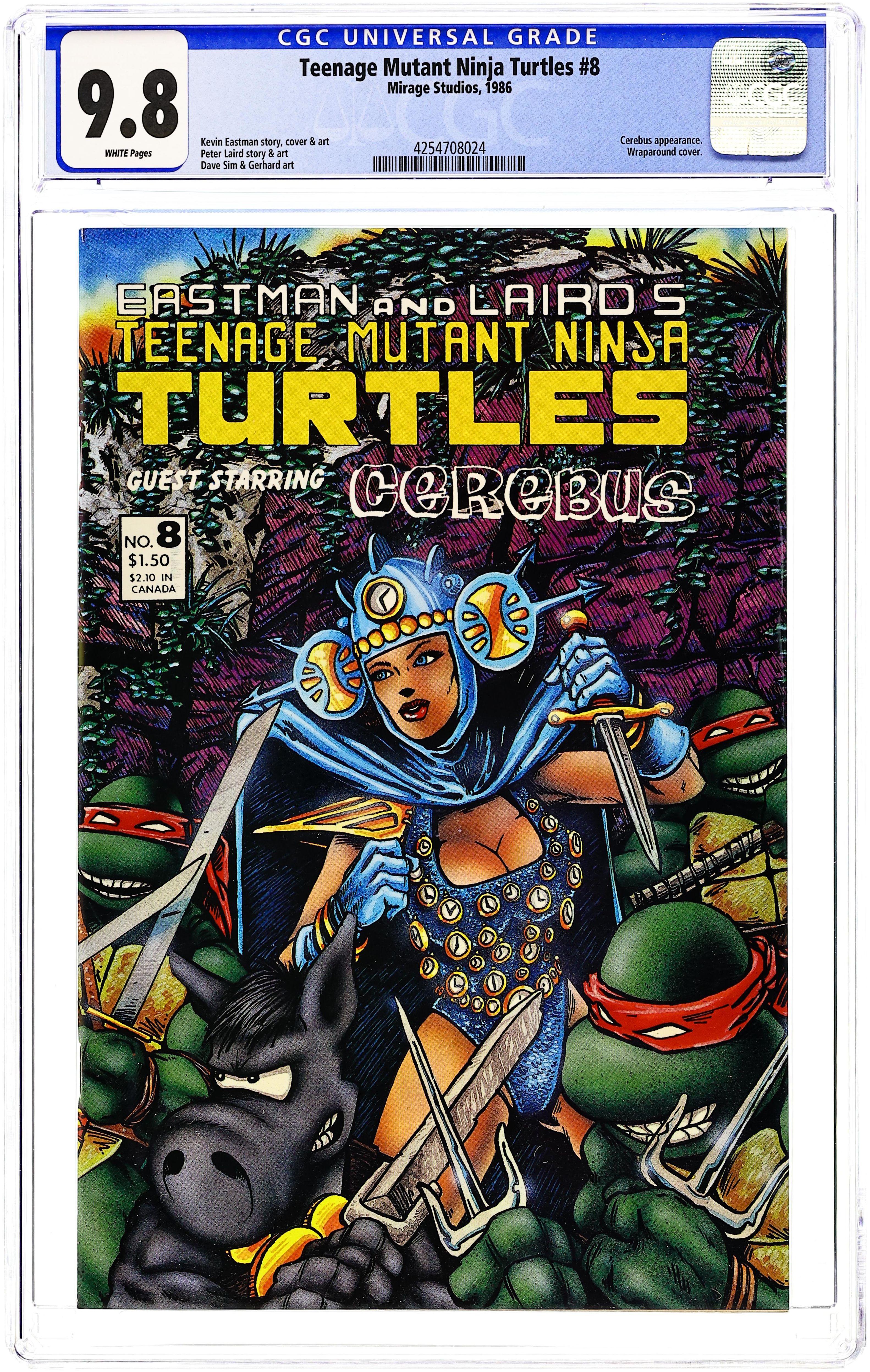 Ended Oct 16 2025 Bid History 11 bids Winning Bid $100 The original series that introduced the Turtles to the world. An errant time traveler accidentally sends the Turtles and herself through time, where they meet Dave Sims Cerebus the Aardvark. Story, art and cover by Dave Sim, Kevin Eastman & Peter Laird; backgrounds by Gerhard. Black and white; 32 pages. Cover price $1.50. Grade: CGC 9.8 explanation of grade Condition: Used (collectible)