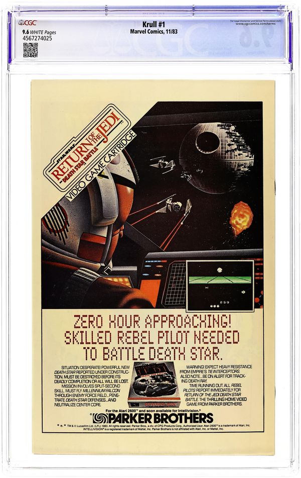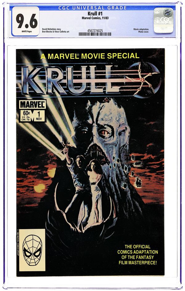 Marvel Comics' official comic adaptation of the 1983 movie "Krull." In this issue, on the day of his wedding, Colwyn's bride, Lyssa, is kidnapped and so the young prince, with the help of an ancient weapon, Ynyr the Old One, Ergo a shapeshifter and a group of thieves, sets out on a quest to rescue her in part one of this adaptation. Script by David Michelinie and art by Bret Blevins & Vince Colletta. Cover price $0.60. Grade: CGC 9.6 explanation of grade Condition: Used (collectible)