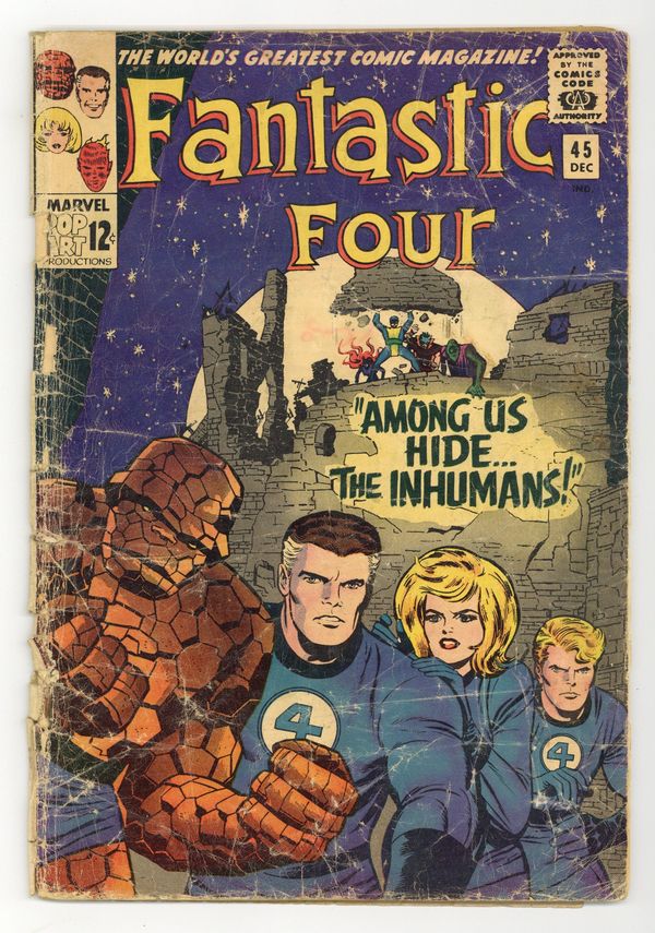 Ended May 24 2025 Winning Bid $47 Cover pencils by Jack Kirby, inks by Joe Sinnott. First appearance of the Inhumans--Black Bolt, Crystal, Karnak, Triton, and Lockjaw—in Among Us Hide...the Inhumans, script by Stan Lee, pencils by Jack Kirby, inks by Joe Sinnott; Crystal lures Johnny into a trap where he is captured by the Inhumans; The rest of the FF hurry to his rescue. Appearances by Medusa, Gorgon, the Dragon Man, the Sandman, and the Trapster. 36 pgs. Cover price $0.12. Grade: PR 0.5 explanation of grade Condition: Used (collectible)