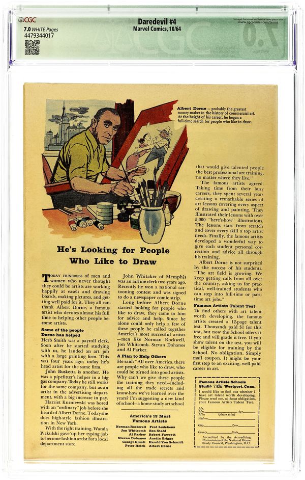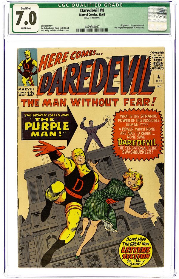 Cover pencils by Jack Kirby, inks by Vince Colletta. First appearance of the Purple Man in Killgrave, the Unbelievable Purple Man!, script by Stan Lee, pencils by Joe Orlando, inks by Vince Colletta; DD runs up against a purple man who can make anyone do what he wants just by suggesting it. First letters page. 36 pgs. Cover price $0.12. Cover price $0.12. Grade: CGC 7.0 explanation of grade Condition: Used (collectible)