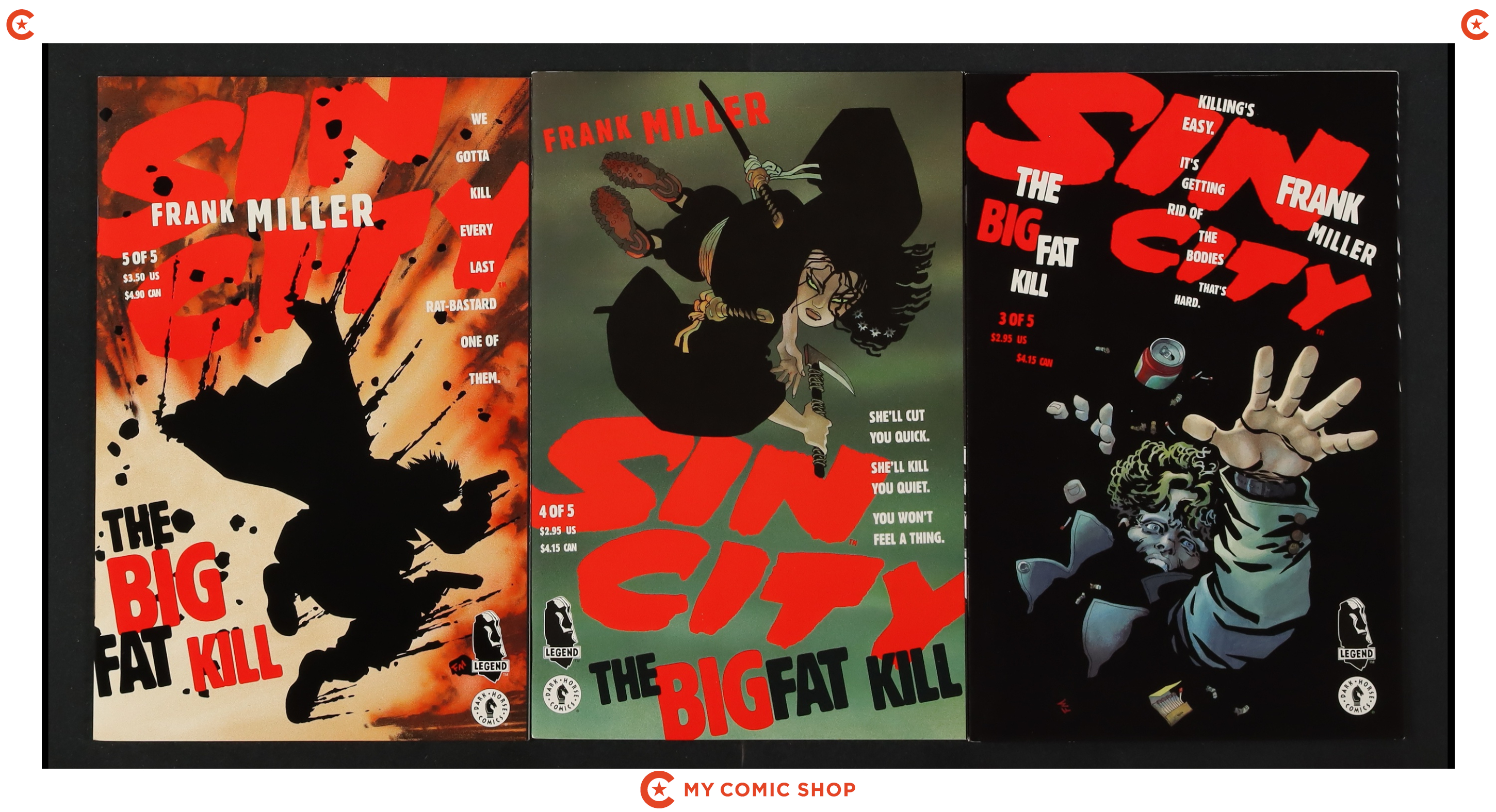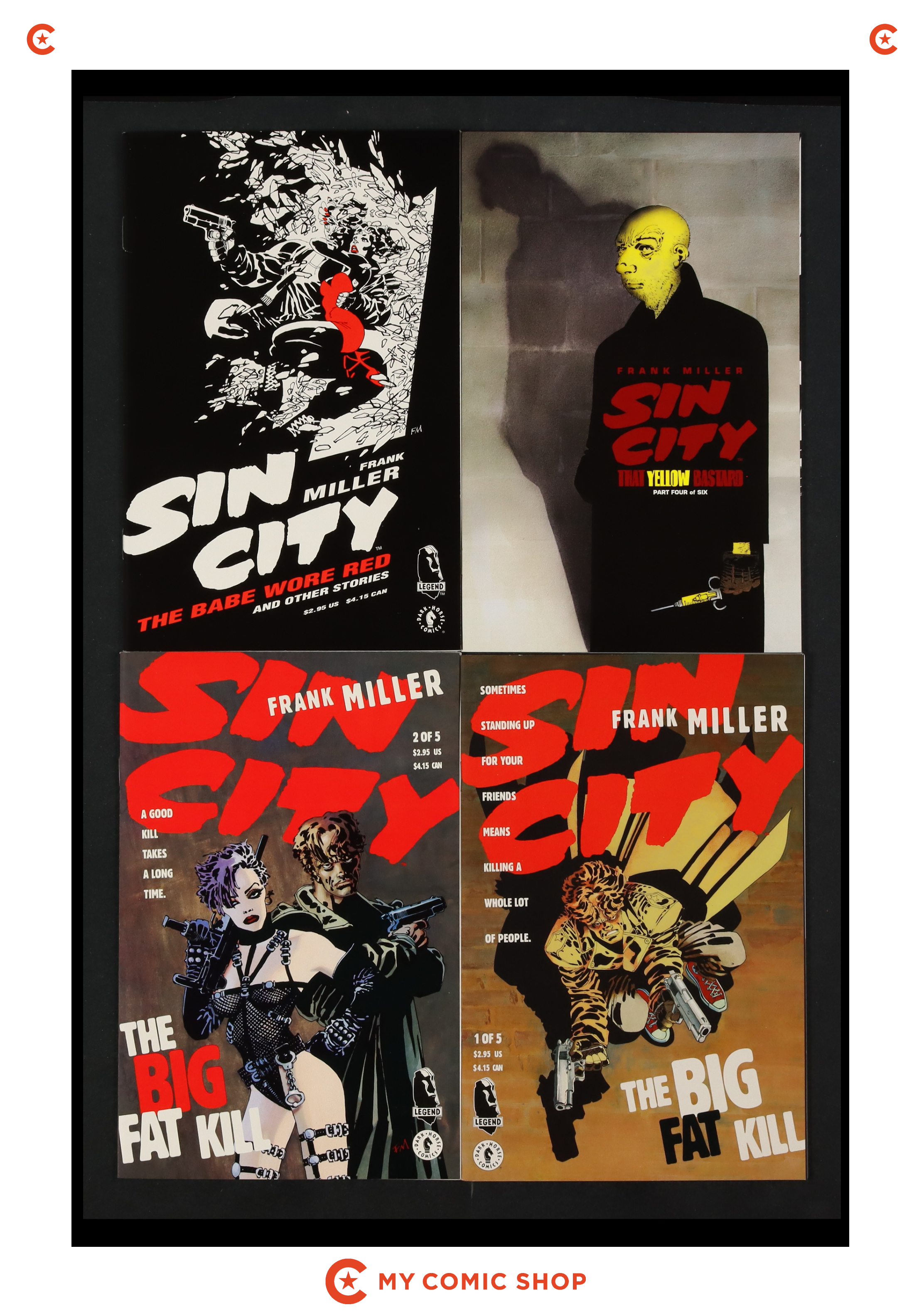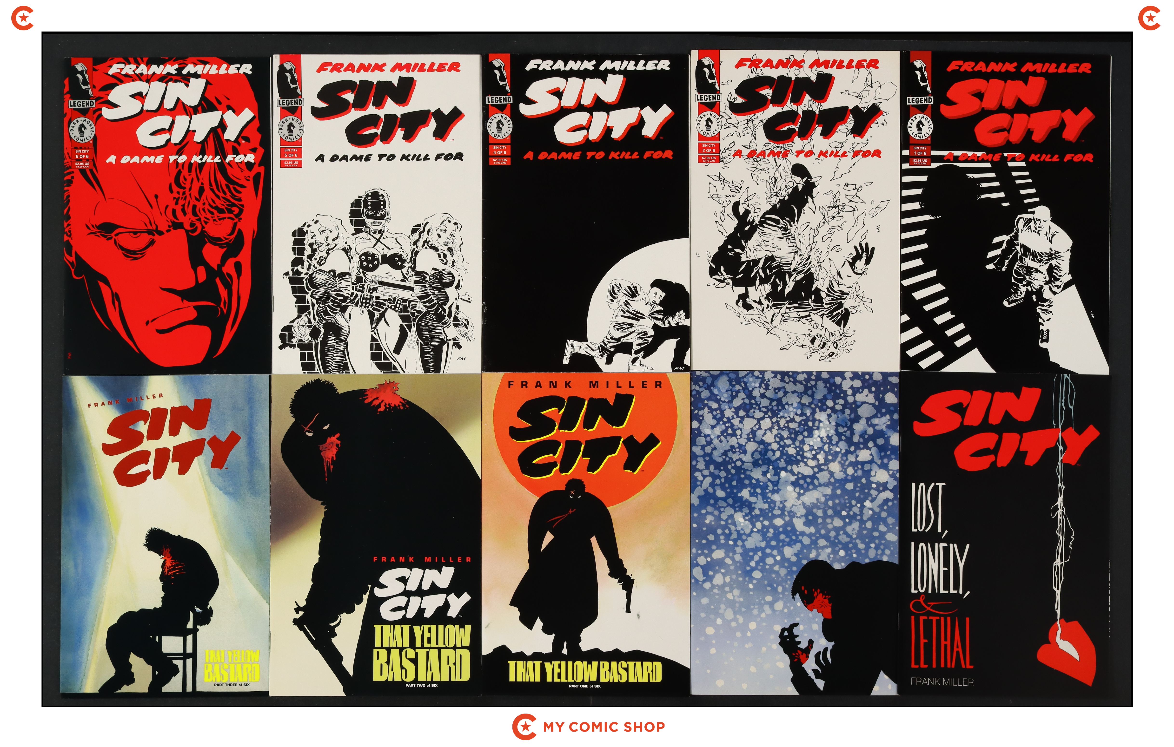 Issues 1A, 2, and 4-6 of Sin City A Dame to Kill For (1993); 1 of Sin City Lost, Lonely and Lethal (1996); 1 of Sin City Silent Night (1995); 1-4 of Sin City That Yellow Bastard (1996); 1 of Sin City The Babe Wore Red and Other Stories (1994); and 1-5 of Sin City The Big Fat Kill (1994). Most will grade in the VF range with a few grading FN+.