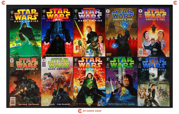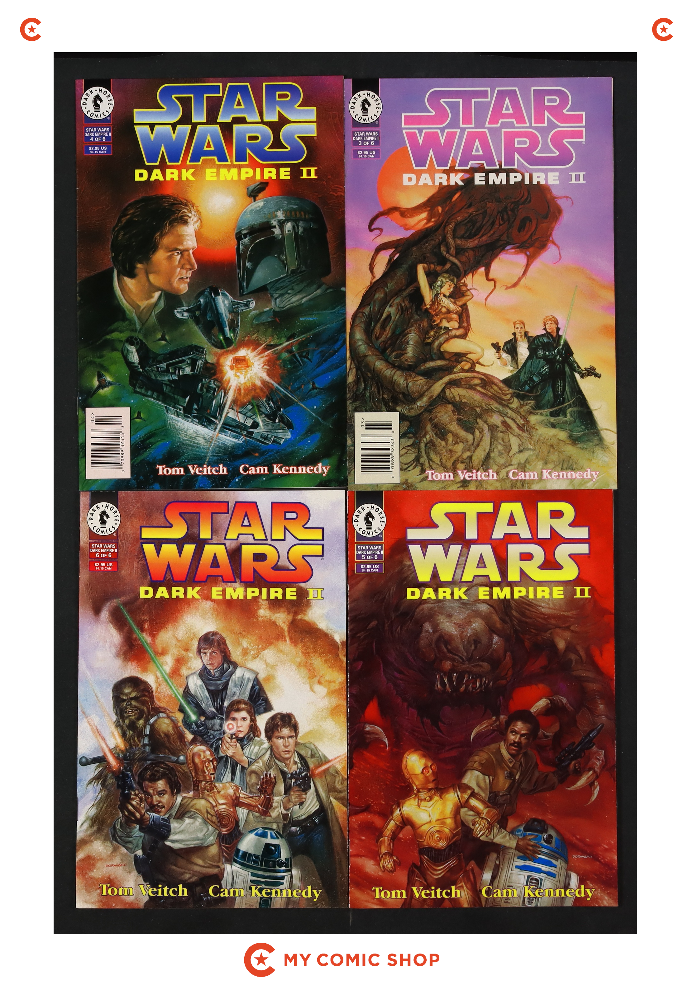 Issues 1 and 2 of Star Wars Empire's End (1995); 1A-6A of Star Wars Dark Empire (1991); 1-5 and 6D of Star Wars Dark Empire II (1994). Most will grade in the VF to FN range.