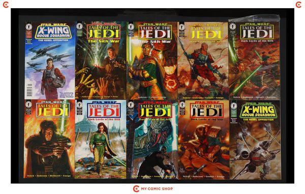 Issues 1-6 of Star Wars Droids (1994 2nd Series); 1 and 2 of Star Wars Droids (1995 3rd Series); 2N and 4N of Star Wars Return of the Jedi (1983 Marvel); 1P and 2 of Star Wars Tales of the Jedi Dark Lords of the Sith (1994); 1 and 2 of Star Wars Tales of the Jedi The Sith War (1995); 1 and 2 of Star Wars X-Wing Rogue Squadron (1995); 3-6 of Star Wars Tales of the Jedi Dark Lords of the Sith (1994). Most will grade in the VF to FN range.