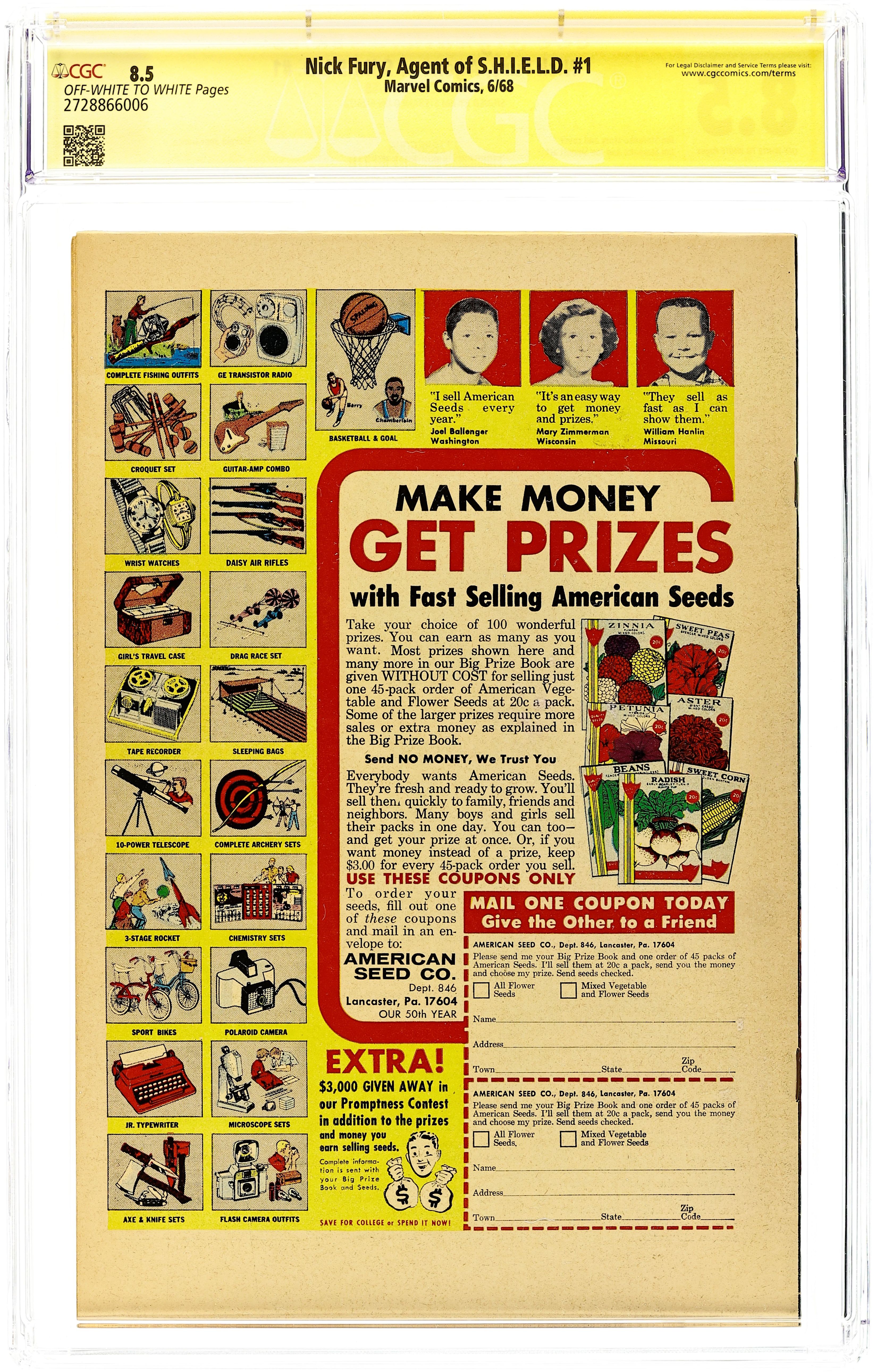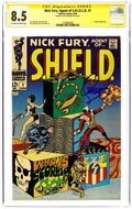 Cover by Jim Steranko. First appearance of Scorpio in "Who Is Scorpio?", script by Jim Steranko, pencils by Jim Steranko, inks by Joe Sinnott; Fury sneaks into an island fortress, only to get shot in the back. Surprise!; It's an L.M.D., and the shooter is the real Fury!; But on examination, Dugan informs Fury the L.M.D.'s been shot 4 times, not 3 - which means, someone tried to assassinate him!; The only clue is a tiny badge with a "Scorpio" symbol on it; In San Francisco, comic Flip Mason's on the run from gambling debts; In Kansas City, racketeer Mitch Hackett looks forward to joining the mob. In NYC, Fury & Val walk in the rain; At the Monza Autodrome, Count Julio Scarlotti wins a race - and we see he has a Scorpio tattoo on his wrist; Days later in Nevada, Fury helps test an "EPB G-System" (Entrope Phase Barrier Guard System), a force field which is hoped may one day protect entire armies. As SHIELD prepares one final test (with an H-Bomb!) we see the tech firing the missile has a Scorpio tattoo on his wrist; Fury suddenly realizes the EPB's down, and nobody answers his comm; He races across the desert to a rocket sled used by NASA to escape as the missile descends on the spot he was relaxing; At the U.S. Government Research Center in Las Vegas, everyone's been put to sleep with gas by Scorpio - when Fury arrives via motorcycle. Letter to the editor from comics writer Don McGregor. Cover price $0.12. Grade: CGC 8.5 explanation of grade Condition: Used (collectible)