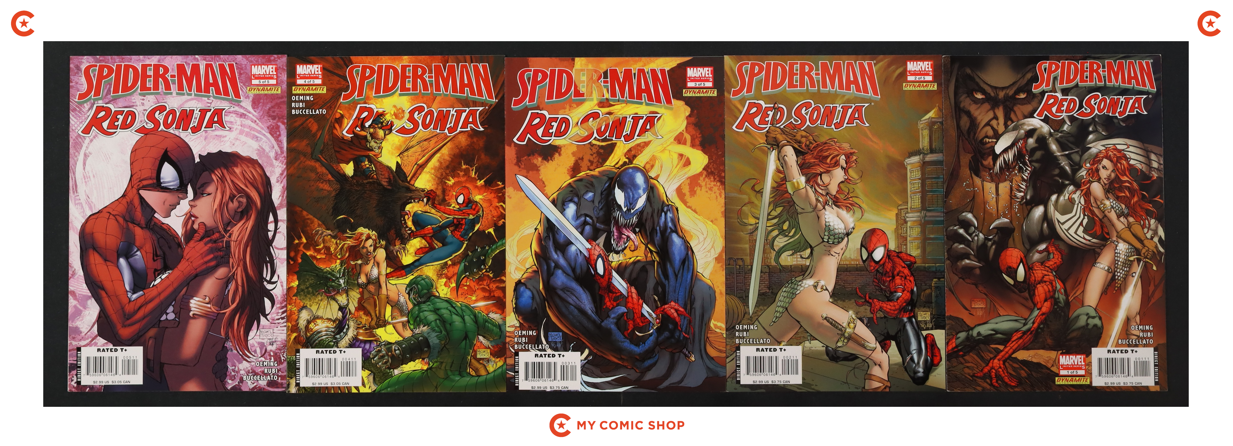Issues 1A, 2A, and 3-5 of Spider-Man Red Sonja (2007). Most will grade in the VF to FN+ range.