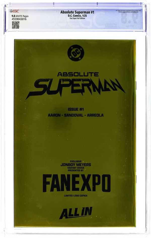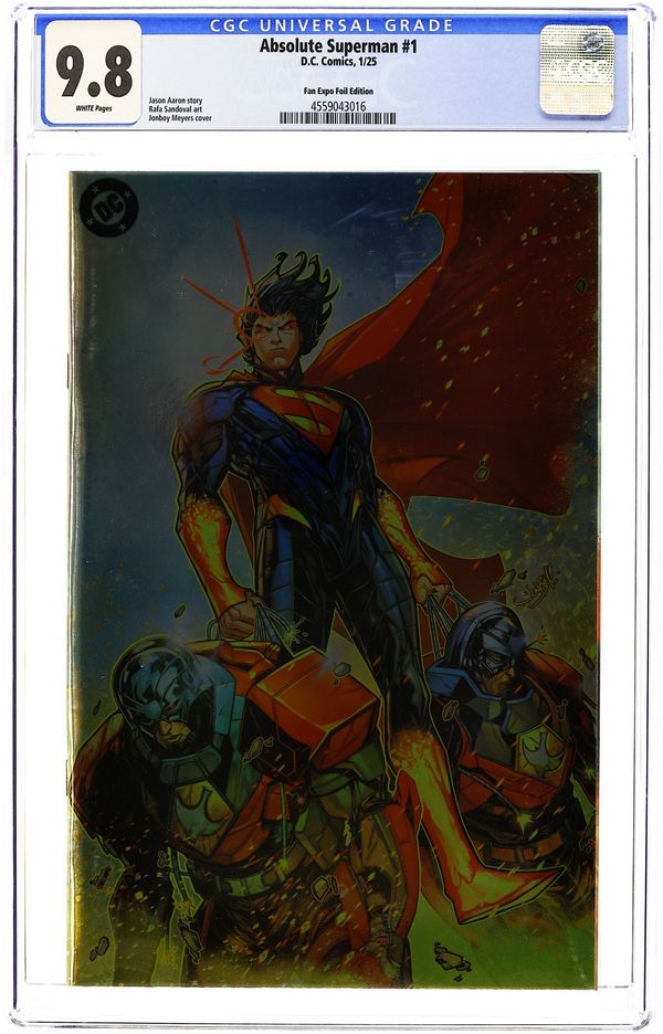 Ended Jun 17 2025 Winning Bid $220 Fan Expo Exclusive Foil Edition Virgin Cover by Jonboy Meyers - limited to 1000 copies. Written by Jason Aaron. Art by Rafa Sandoval. SUPERSTARS JASON AARON AND RAFA SANDOVAL UNLEASH A SHOCKING NEW TAKE ON THE LAST SON OF KRYPTON! Without the fortress...without the family...without a home...what's left is the Absolute Man of Steel! 48 pages, full color. Rated T+ Grade: CGC 9.8 explanation of grade Condition: Used (collectible) unless item is a new release