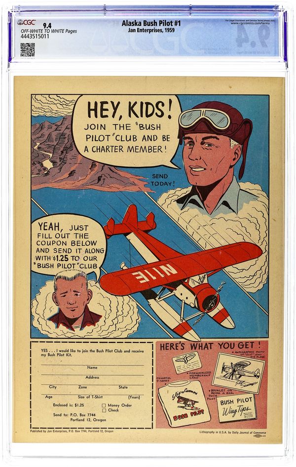 Ended Jul 14 2025 Bid History 15 bids Winning Bid $117 Alaska Bush Pilot (1959) is a promotional comic published by Jan Enterprises, Portland, Oregon, and printed by the Daily Journal of Commerce. Back page advertises and has promotional offer to join the Bush-Pilot Club. Partial color and black-and-white, 7.5-in. x 10.25-in., newsprint, 10c cover price. Issue # on cover is 1-1. Cover price $0.10. Grade: CGC 9.4 explanation of grade Condition: Used (collectible)