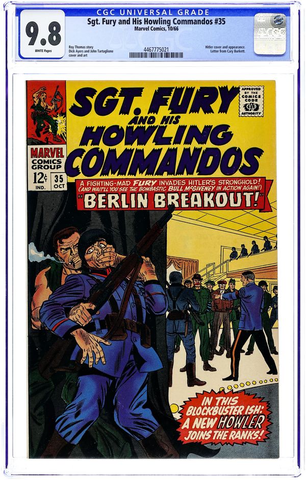 Ended Jul 16 2025 Winning Bid $226 Cover pencils by Dick Ayers, inks by John Tartaglione. "Berlin Breakout!", script by Roy Thomas, pencils by Dick Ayers, inks by John Tartaglione; Captain Sawyer selects the members of the mission to rescue the Howlers, captured in Greece, who are bound for Berlin for a high-profile execution; Fury is given ex-Nazi Eric Koenig, Bull McGiveney, and his corporal, Rickets Johnson; They infiltrate the Berlin event with the help of Eric's sister, Ilsa, a double-agent working for the Nazis. They rescue the Howlers, but Dino Manelli is seriously wounded, and will not return to fight. Eric Koenig is named as his replacement. 36 pgs., full color. $0.12. Cover price $0.12. Grade: CGC 9.8 explanation of grade Condition: Used (collectible)