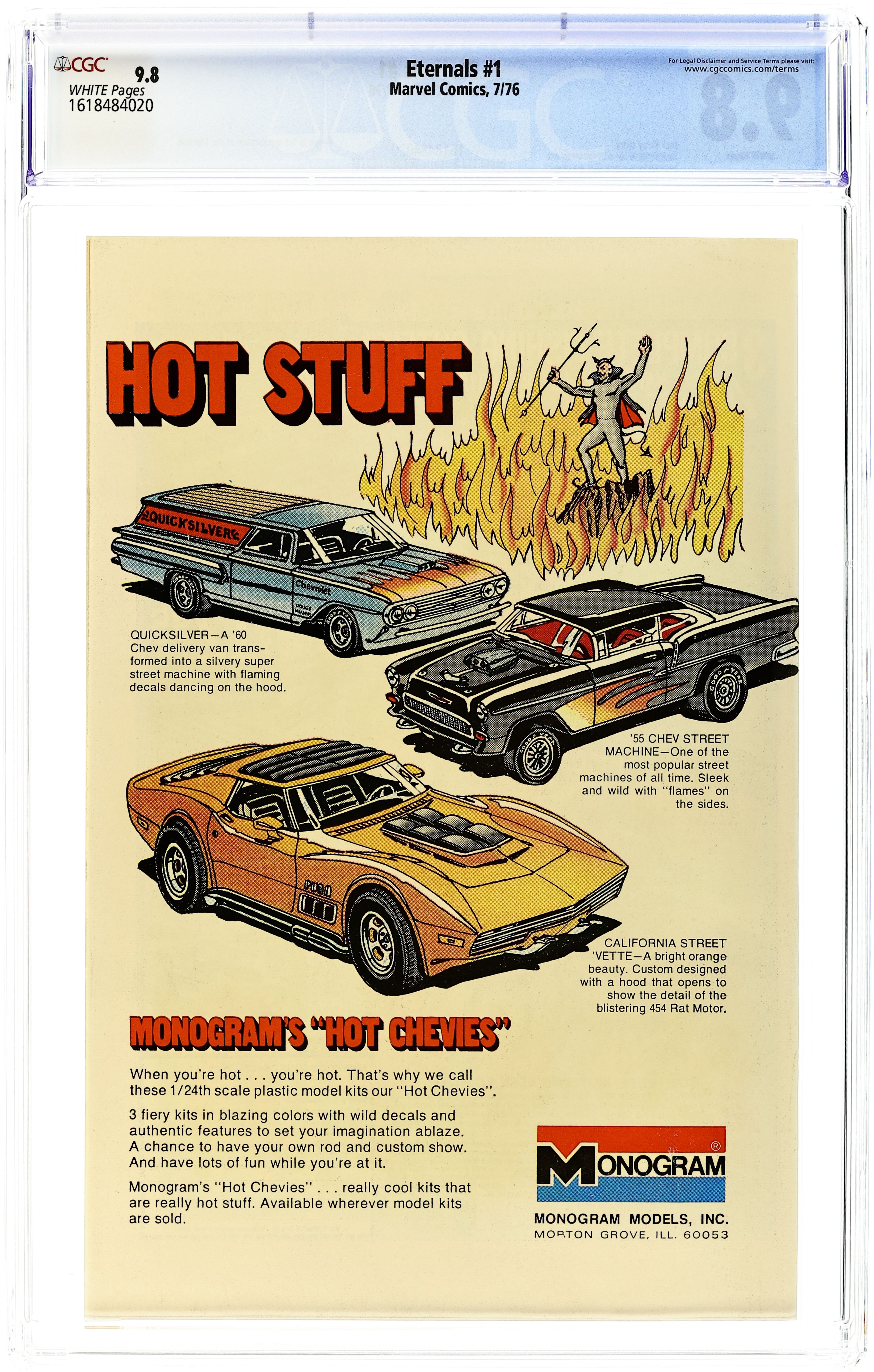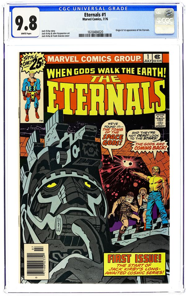 "The Day of the Gods." Written by Jack Kirby. Pencils by Jack Kirby. Inks by John Verpoorten. What if all the stories were true? All myths...all the legends... What if all the stories about gods and monsters were true? For archeologist Doctor Damian and his daughter Margo, those legends are about to become reality. The gods are real and they've lived among us for centuries. 1st appearance of Ikaris, Makkari, Kro and the Eternals as a team . 36 pages, full color. Cover price $0.25. Grade: CGC 9.8 explanation of grade Condition: Used (collectible)