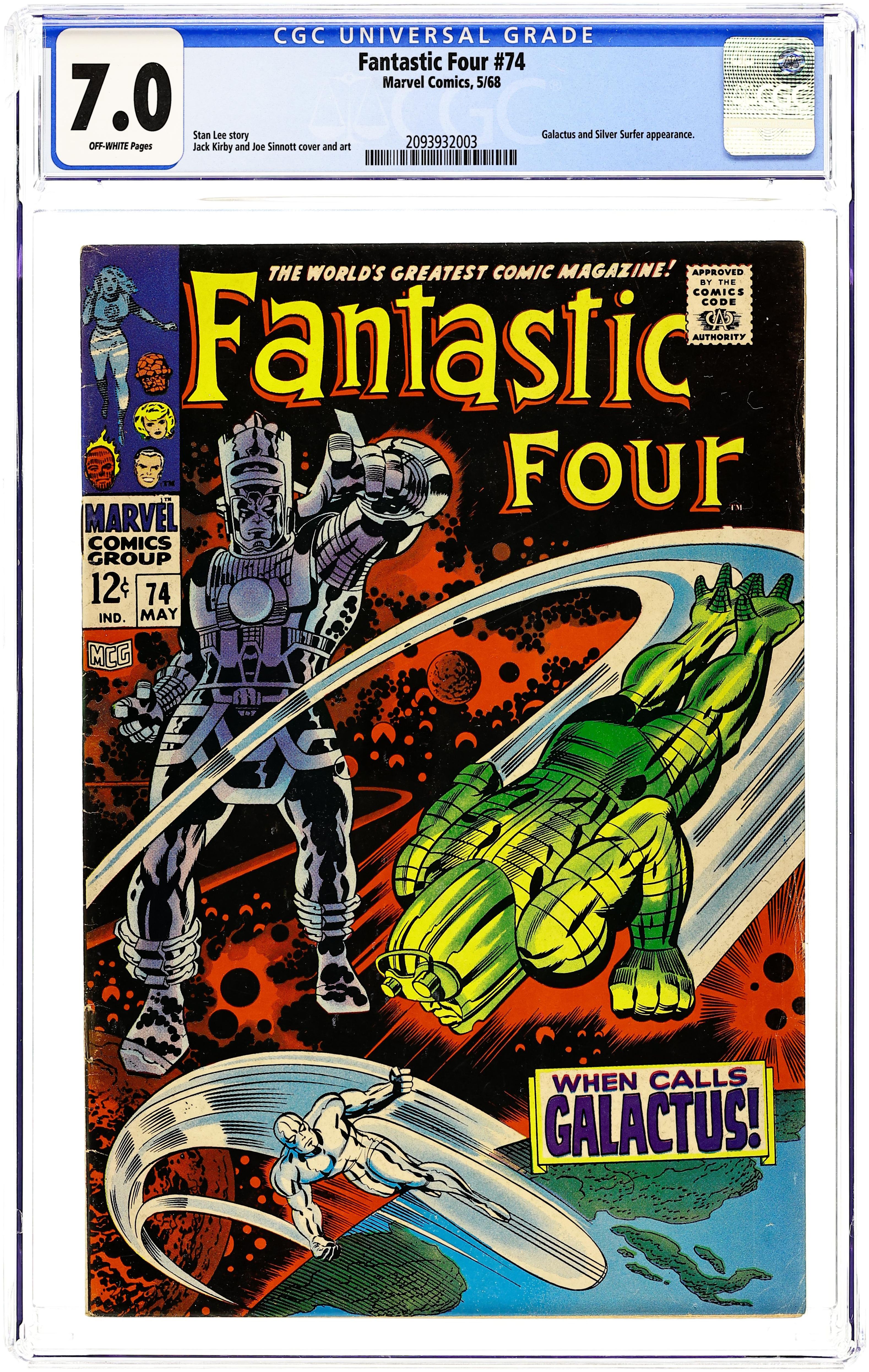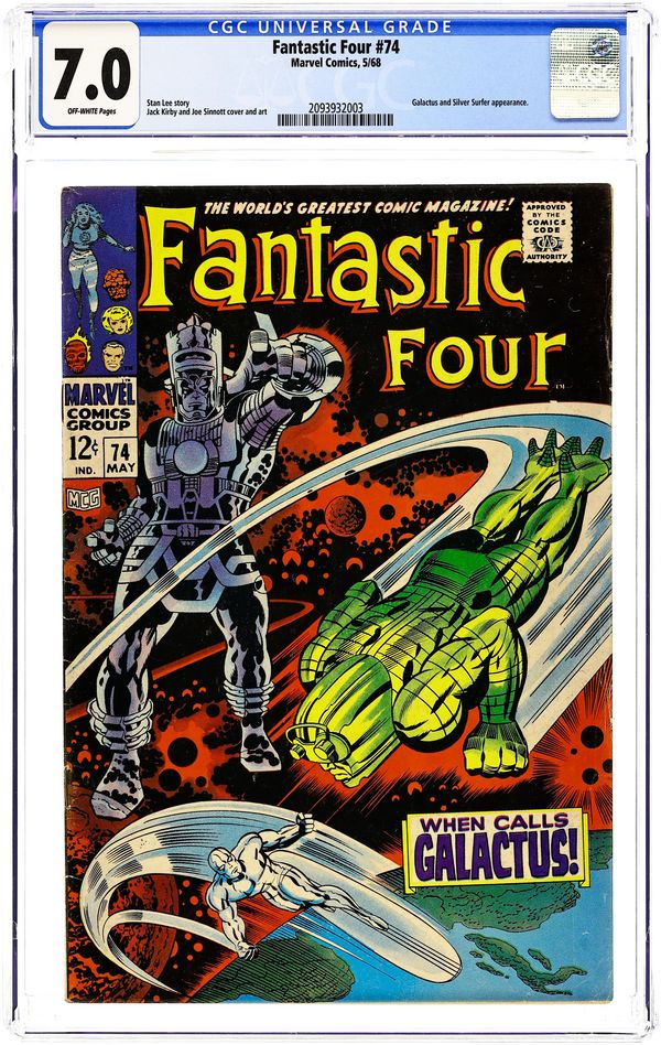 Ended Jun 17 2025 Winning Bid $80 Cover pencils by Jack Kirby, inks by Joe Sinnott. The Silver Surfer, Galactus, and Crystal (of the Inhumans) guest star in When Calls Galactus, script by Stan Lee and Jack Kirby (co-plot), pencils by Jack Kirby, inks by Joe Sinnott; Galactus dispatches his Punisher to retrieve the Surfer who is protected by the FF. Letters to the editor from comics writers Don McGregor and Tony Isabella. Kirby/Sinnott cover. Reprinted in Marvel's Greatest Comics # 56. 36 pgs. Cover price $0.12. Grade: CGC 7.0 explanation of grade Condition: Used (collectible)