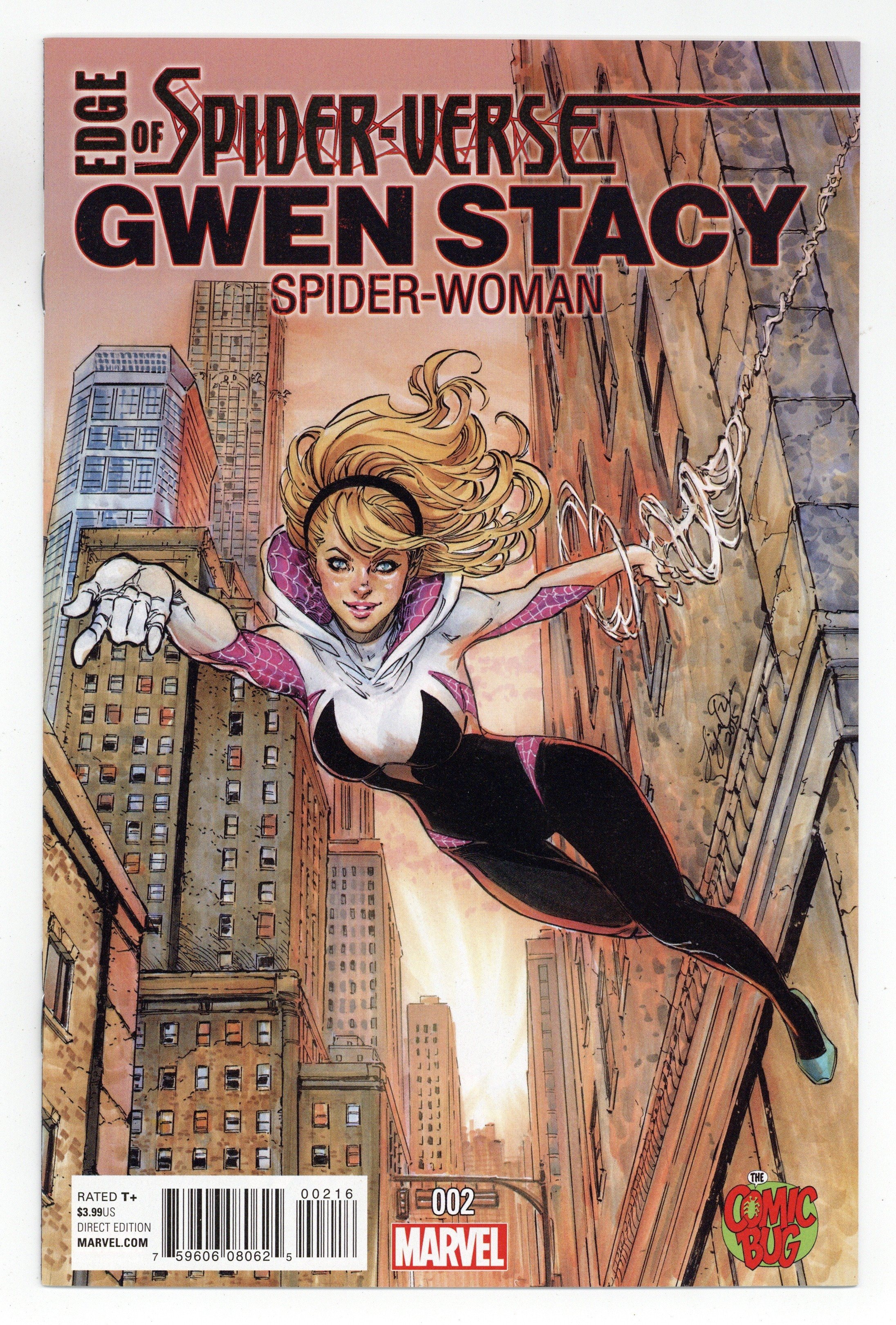 Comic Bug variant cover by Siya Oum. Edge of Spider-Verse: Part 3 of 10 - Written by Jason Latour. Art by Robbi Rodriguez. GWEN STACY: SPIDER-WOMAN! In one universe, it wasn't Peter Parker bitten by the radioactive Spider, but Gwen Stacy! She's smart, charming and can lift a car-- Just don't tell her Police Chief father! How is she involved in Spider-Verse? Seeds of AMAZING SPIDER-MAN #9 are planted here! 28 pages, full color. Rated T+ Cover price $3.99. Grade: VF 8.0 explanation of grade Condition: Used (collectible)