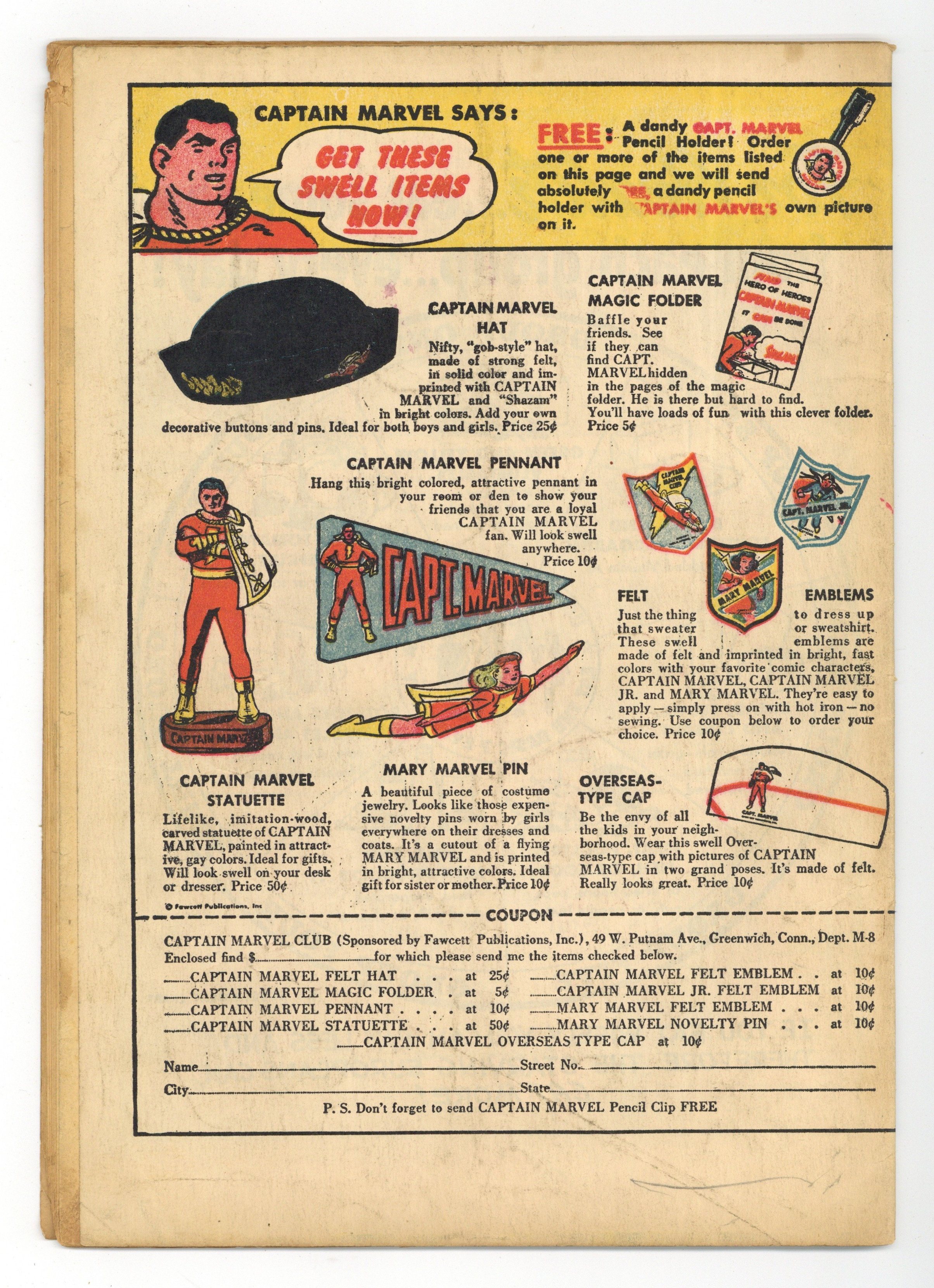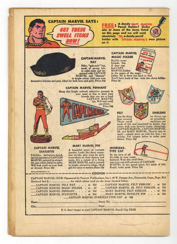 Ended Jul 14 2025 Winning Bid $111 Cover pencils by C. C. Beck, inks by Pete Costanza. The Marvel Family and Aunty Anti-Marvel, script by Otto Binder, art by C. C. Beck; Dr. Sivana disguises himself as a new member of the Marvel Family: Aunty Marvel. Mary Marvel and The Black Magician, script by Otto Binder, art by Jack Binder. Mobali Man's Courage text story by Chester Whitehorn. Captain Marvel, Jr. Vs. The Wild Woods Boy, script by Otto Binder. Captain Marvel and The Miracle Worker, script by Otto Binder. Captain Marvel Club ad. 36 Pages, Full Color. Cover price $0.10. Grade: GD+ 2.5 explanation of grade Condition: Used (collectible)