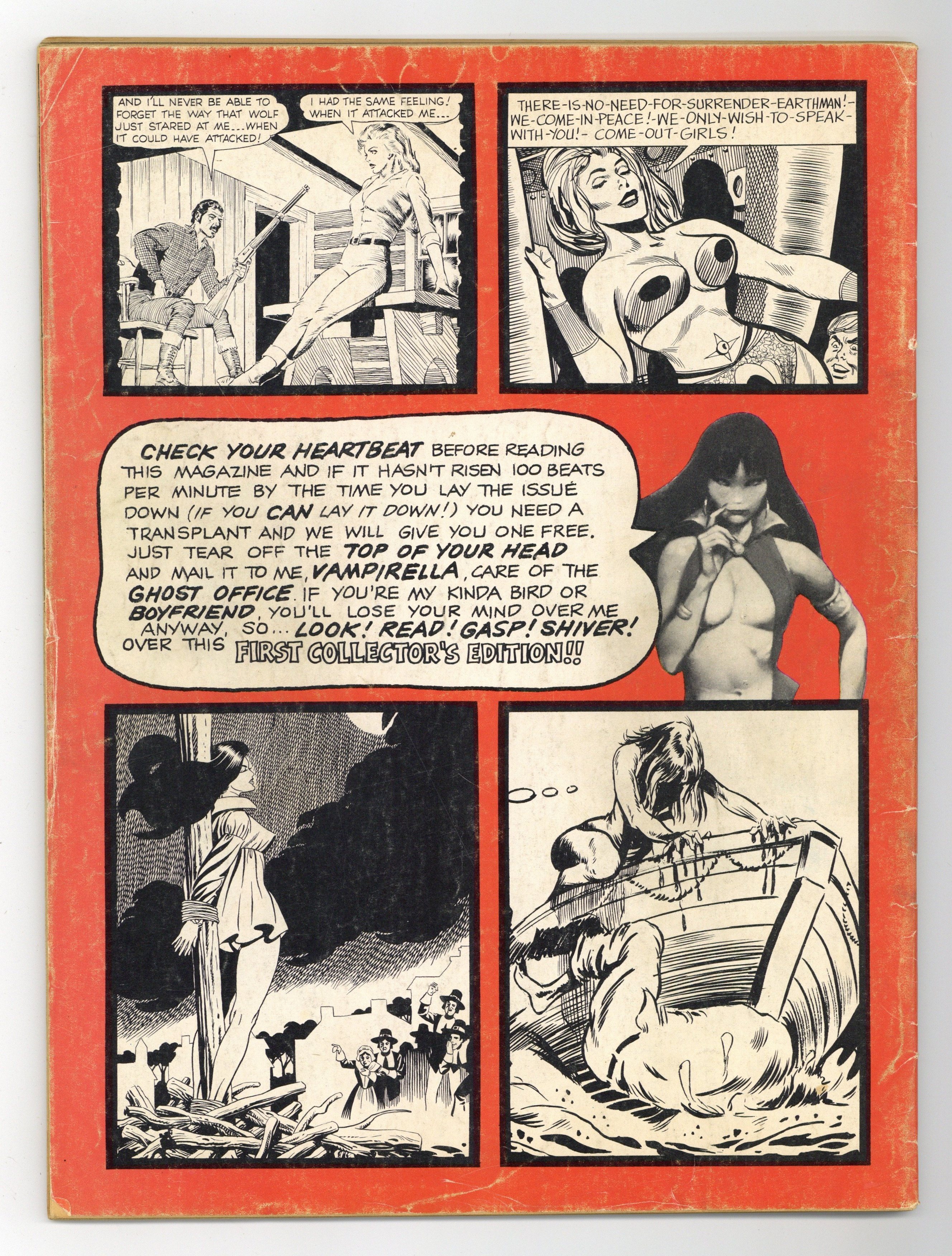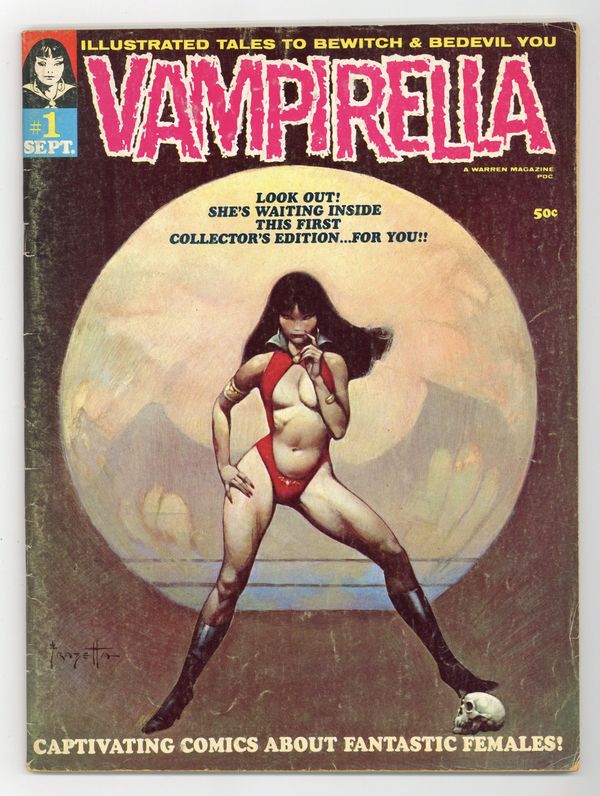Ended Jul 17 2025 Winning Bid $642 Published by James Warren, who gave fandom Famous Monsters, Eerie, Creepy, and other great magazines, Vampirella is a horror anthology series that featured stories and art by such genre giants as Richard Corben, Neal Adams, Archie Goodwin, Steve Englehart, Don Glut, Wally Wood, and many, many others. This first issue includes the following: "Vampirella's Welcome" by Bill Parente and Frank Frazetta; "Vampirella of Draculon" by Forrest J Ackerman (who had a hand in creating vampi vixen Vampirella) and Tom Sutton; "Death Boat" by Don Glut and Billy Graham; "Two Silver Bullets" by Don Glut and Mike Royer; "Spaced-Out Girls" by Don Glut, Bill Fraccio, and Tony Tallarico; and "Room Full of Changes" by Nicola Cuti and Ernie Colon. Cover art by Frank Frazetta. NOTE: A commemorative edition of this magazine was published in October 2001. It is very similar to the original, but can be easily identified by the $4.95 cover price (original 1969 edition was 50c cover priced), and an indica noting it as the commemorative edition. 68 pages, B&W. Cover price $0.50. Grade: VG- 3.5 explanation of grade Condition: Used (collectible)