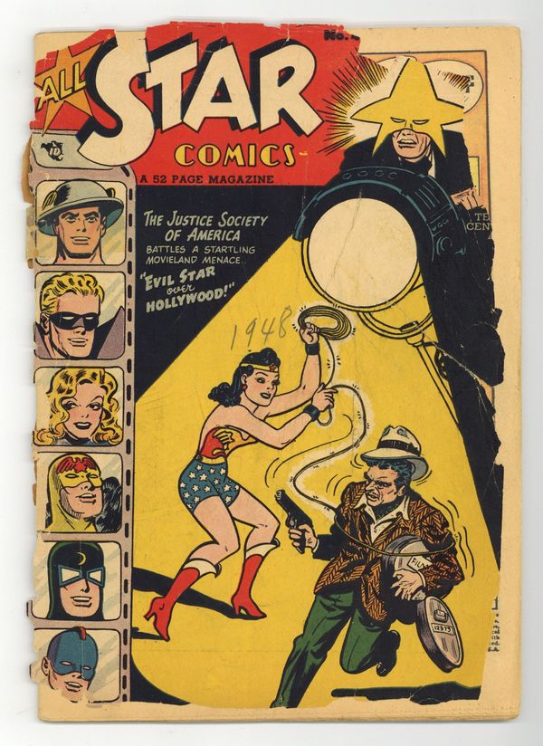 The Justice Society of America in "Evil Star Over Hollywood!" Script by John Broome. Pencils by Irwin Hasen (splash page and chapters 1 and 3) and Arthur Peddy (chapter 2); inks by Bob Oksner (splash and chapter 1) and Bernard Sachs (chapters 2 and 3). Back-up Johnny Peril's Surprise Story, "When the Moon Fell!" Two-page article on Easter Island, "The Puzzle of the Pacific" by Charles King. Hasen cover. 52 Pages, Full Color. Cover price $0.10. Grade: PR 0.5 explanation of grade Condition: Used (collectible)