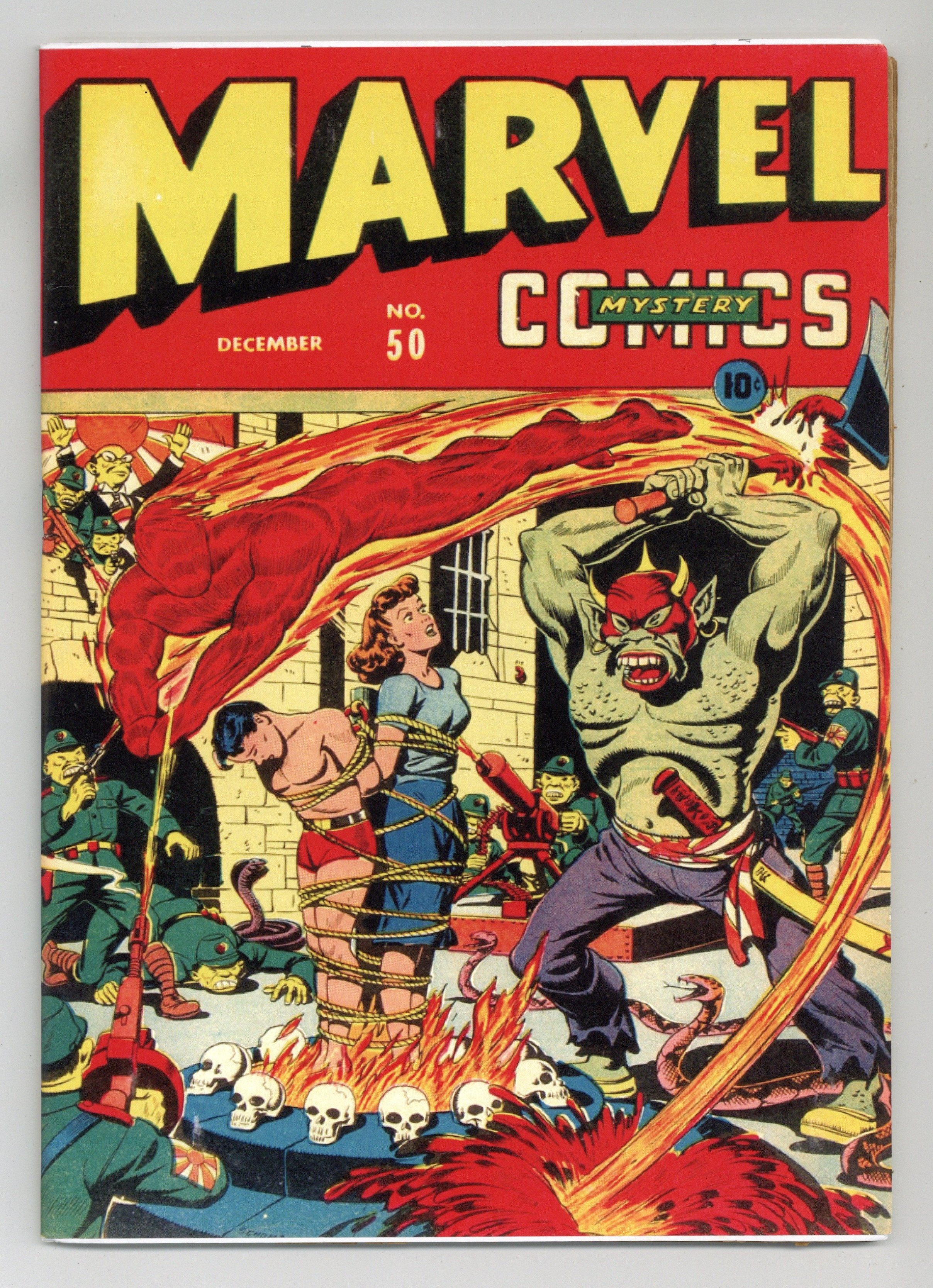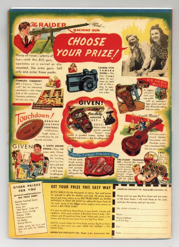 Cover art by Alex Schomburg. Battling the Nazi Vultures starring Human Torch, inks by Harry Sahle. Eerie Owl of the Wolf Pack starring Sub-Mariner, art by Allen Simon. Deadline Dawson's Pay-Off starring Terry Vance, art by Bob Oskner. The First Time text story. Miss America untitled story, script by Otto Binder, art by Charles Nicholas. Introducing Miss Patriot. Angel untitled story, art by Gustav Schrotter. 60 pages. Cover price $0.10. Grade: Coverless explanation of grade Condition: Used (collectible)