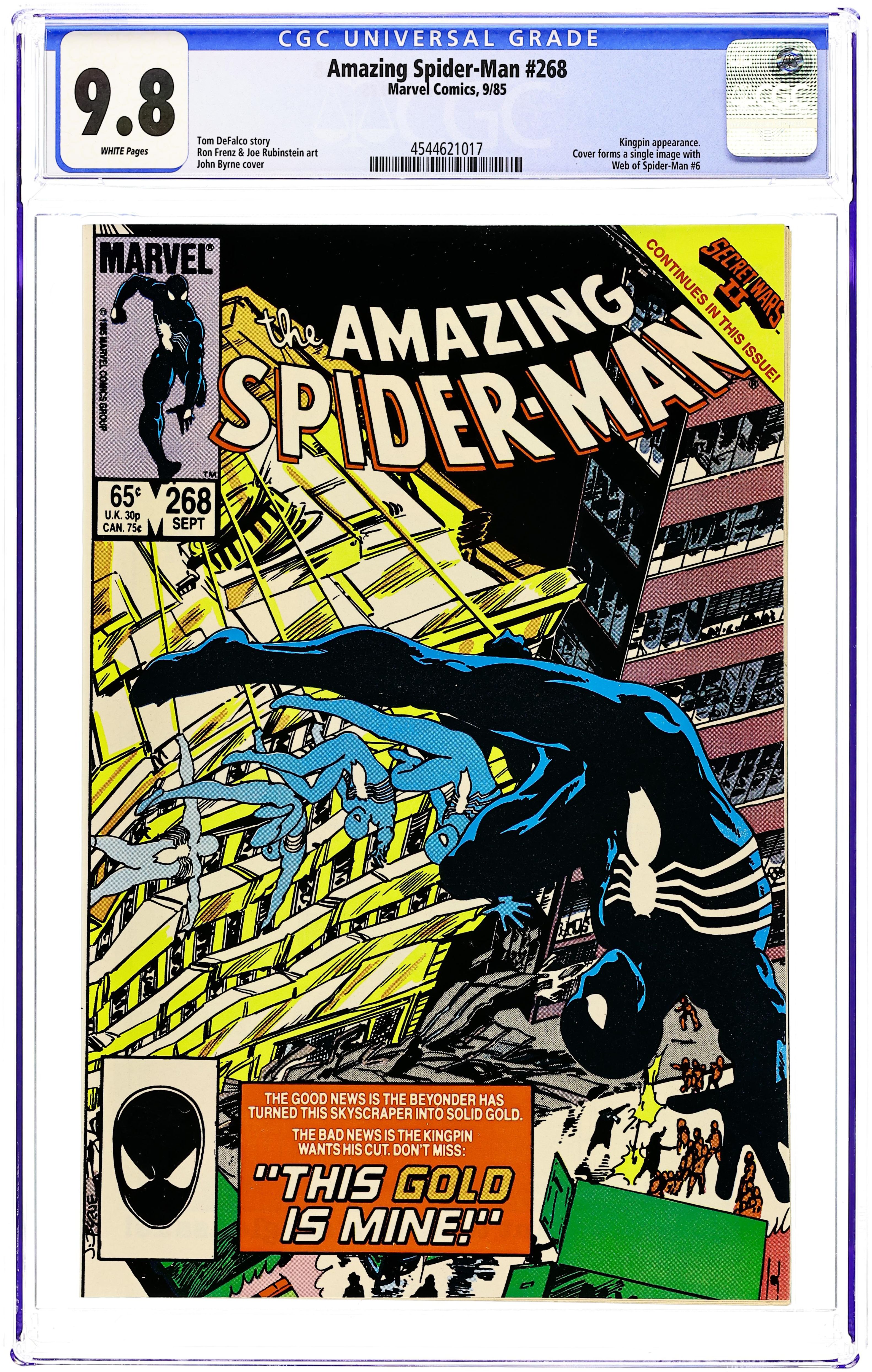 Ended Jun 9 2025 Winning Bid $57 "This Gold is Mine!" Secret Wars II crossover. Part 2 of 2. Script by Tom DeFalco. Pencils by Ron Frenz. Inks by Joe Rubinstein. Cover by John Byrne. Story continues from Web of Spider-Man 6. In incredible fashion the Beyonder turned Power Man and Iron Fist's office building into gold! Everyone will be rich! But hold on...the world's financial markets will collapse with tons of gold dumped into the global economy! So, it's the federal government to the rescue! Under the wall-crawler's watchful eye, the military transports the gold to the west side docks and loads it on cargo ships bound for the Great Puerto Rican trench! However the Kingpin of Crime wants his cut of the gold! So, the Arranger and his henchmen hijack one of the ships! Will Spider-Man make the big city pirates walk the plank? Cameo appearances by J. Jonah Jameson, Ned Leeds, Joe Robertson, and Firelord. (Notes: The cover of this issue can be paired with the cover of Web of Spider-Man 6 to form a complete image of the office building turned into gold. Avengers 258 offers a preview of the web-slinger's upcoming battle vs. Firelord. This issue was reprinted in Marvel Tales 278.) 36 pages. Cover price $0.65. Grade: CGC 9.8 explanation of grade Condition: Used (collectible)