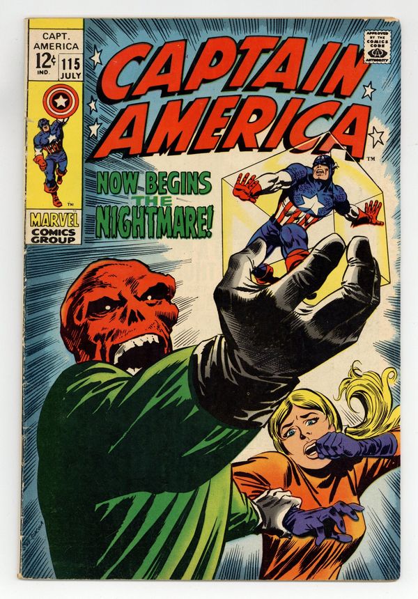 Ended May 16 2025 Winning Bid $49 Last 12-cent cover price. Cover pencils by Marie Severin, inks by Frank Giacoia. Using the Cosmic Cube, the Red Skull switches bodies with Captain America in "Now Begins the Nightmare!", script by Stan Lee, pencils by John Buscema, inks by Sal Buscema (Panels 3 and 4 of page 12 retouched by John Romita Sr.); With the Cosmic Cube in his possession, the Red Skull confronts Captain America; Back at SHIELD headquarters, Rick Jones searches for Captain America and asks Sharon Carter if she has seen him; Although she is testing a new SHIELD weapon, Sharon tells Rick that he hasn't seen Captain America since she rejected his request that she leave SHIELD; Rick contacts his old gang of Ham radio enthusiasts, the Teen Brigade, and asks them all to out for Captain America and report back if they see him; Meanwhile, the Red Skull continues using the Cosmic Cube in ways to drive Captain America insane, hurtling him from this realm to different worlds and shrinking him down in size. 36 pgs., full color. $0.12. Cover price $0.12. Grade: VG 4.0 explanation of grade Condition: Used (collectible)